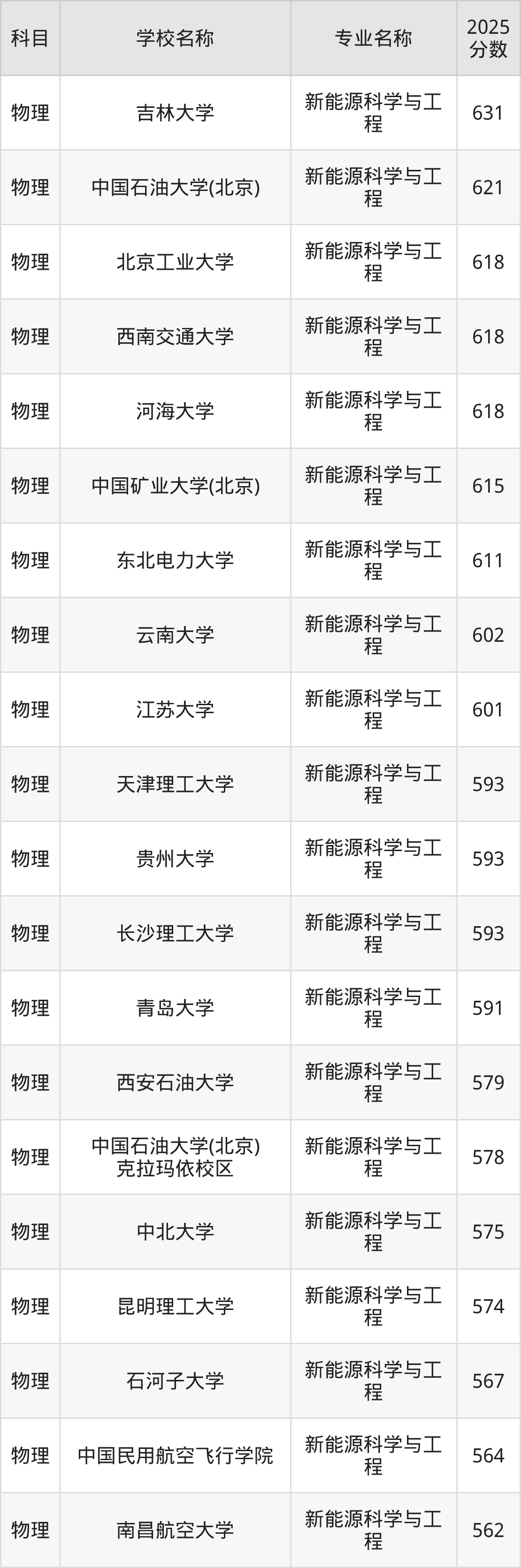 通过上文大家可以知晓,在辽宁省内招新能源科学与工程专业的院校数量较少,所以下文将为2026届高考生继续展示:省外大学的新能源科学与工程专业2025年在辽宁高考的录取情况,包含吉林大学、中国石油大学(北京)、北京工业大学、西南交通大学、河海大学。