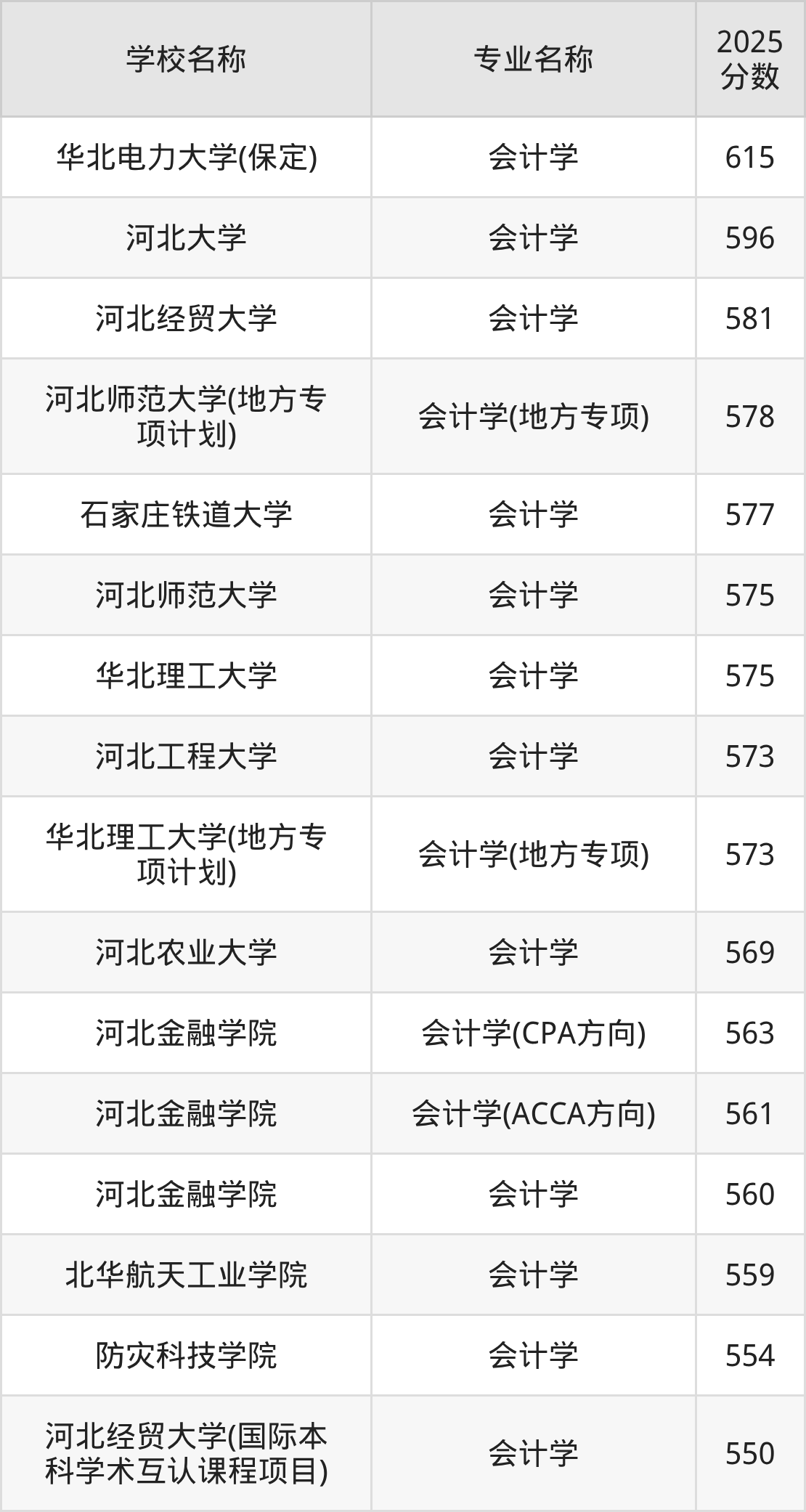 圆梦小编根据河北2025年高考历史组专业分,将开设了会计学专业且位于河北省内的大学按照“录取分”从高到低排序,得出了以上榜单。
