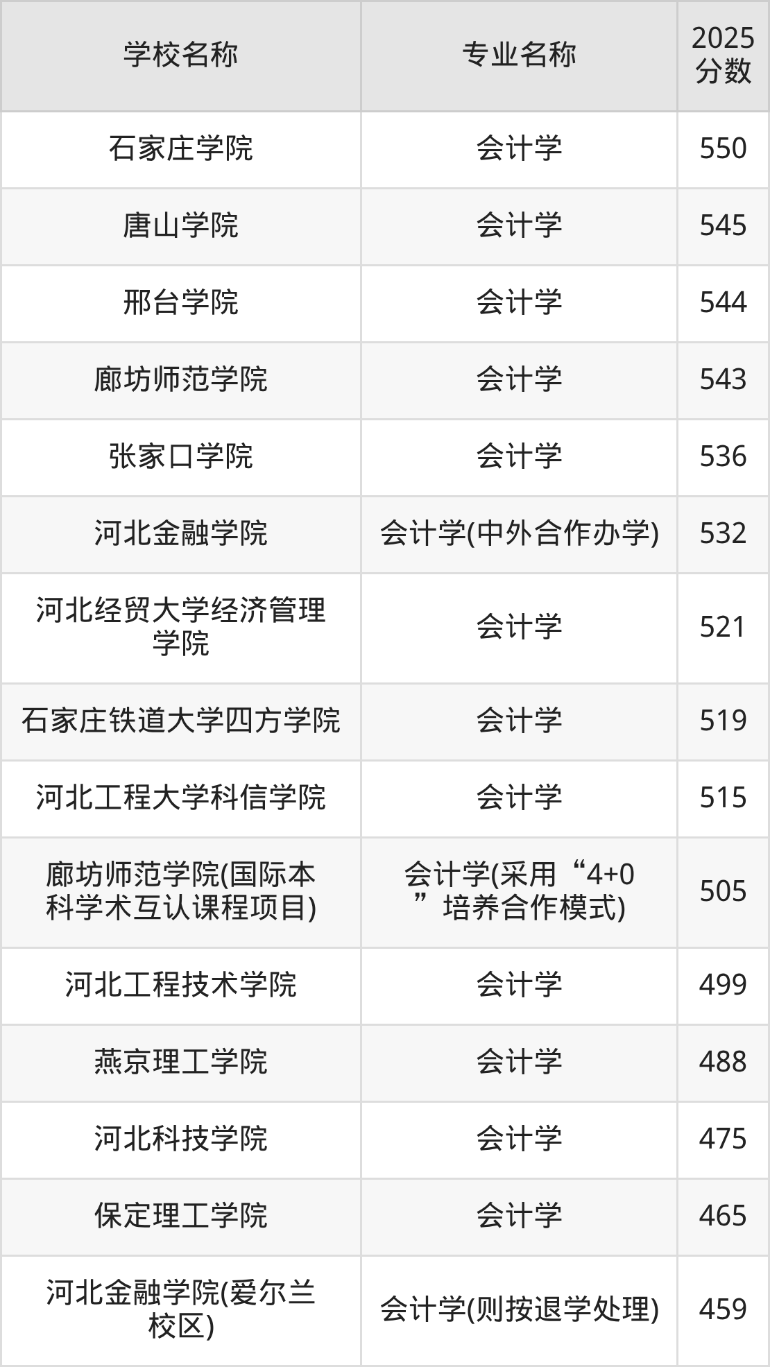 下文将为大家展示河北省大学会计学专业2025年在河北高考的最低录取分数线!