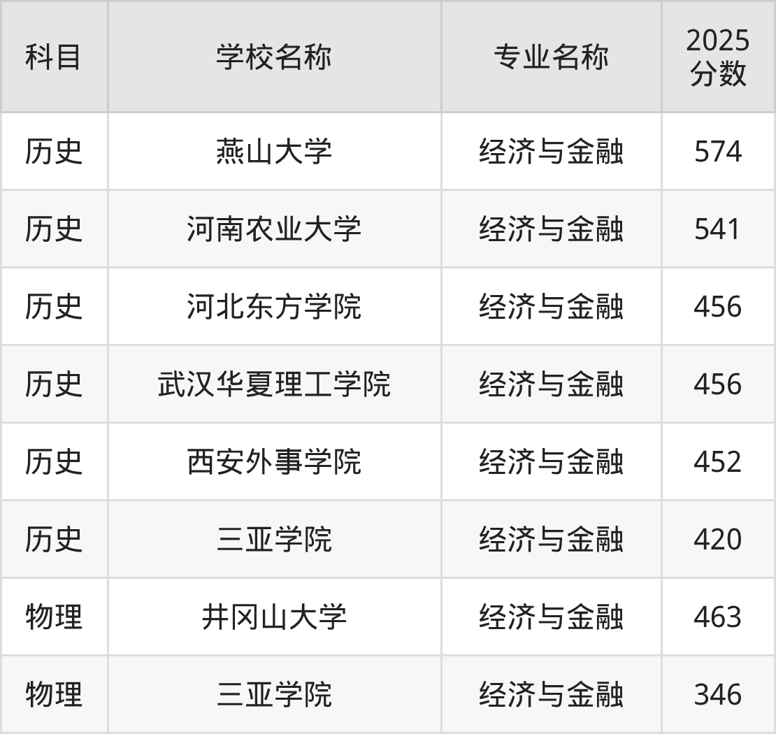 通过上文大家可以知晓,在内蒙古自治区内招经济与金融专业的院校数量较少,所以下文将为2026届高考生继续展示:自治区外大学的经济与金融专业2025年在内蒙古高考的录取情况,包含燕山大学、河南农业大学、河北东方学院、武汉华夏理工学院、西安外事学院。