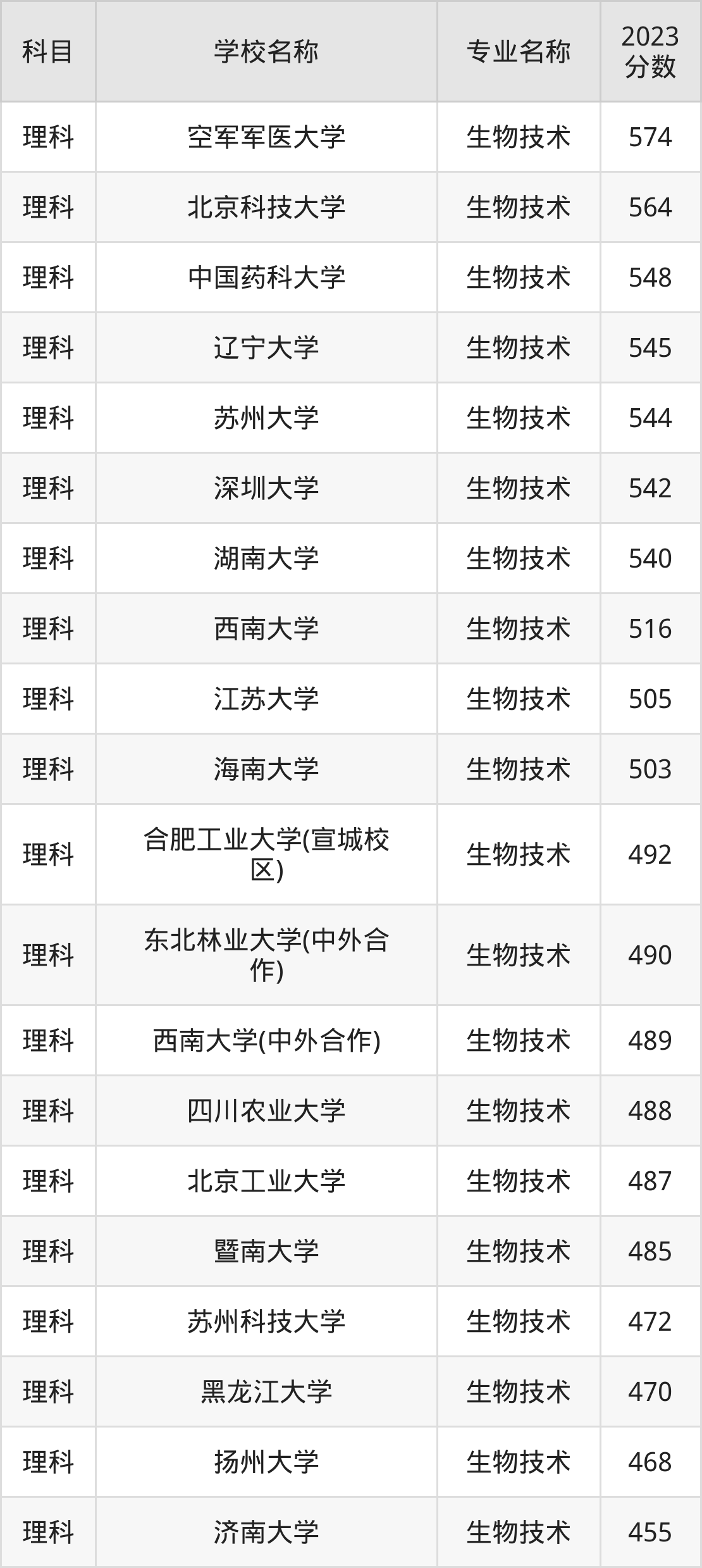 通过上文大家可以知晓,在吉林省内招生物技术专业的院校数量较少,所以下文将为2025届高考生继续展示:省外大学的生物技术专业2023年在吉林高考的录取情况,包含空军军医大学、北京科技大学、中国药科大学、辽宁大学、苏州大学。