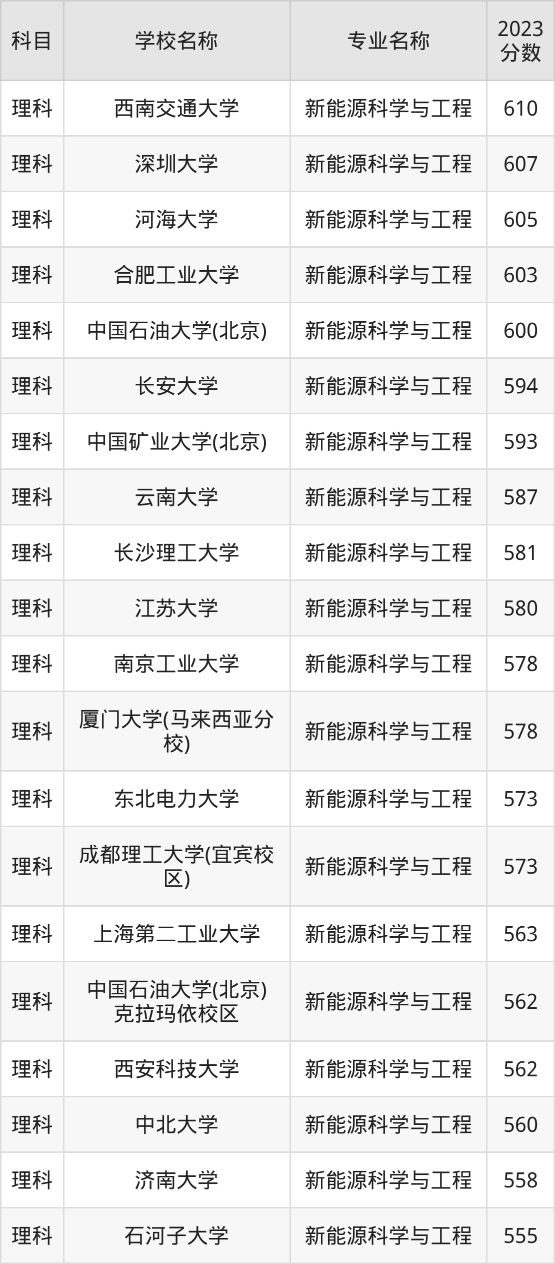 通过上文大家可以知晓,在江西省内招新能源科学与工程专业的院校数量较少,所以下文将为2025届高考生继续展示:省外大学的新能源科学与工程专业2023年在江西高考的录取情况,包含西南交通大学、深圳大学、河海大学、合肥工业大学、中国石油大学(北京)。