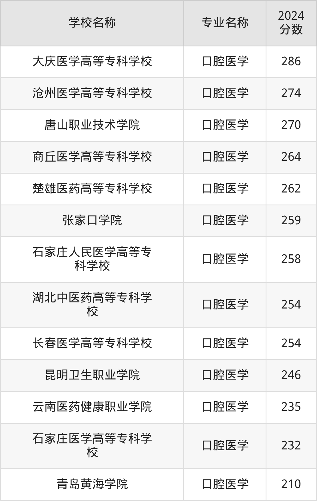 | 天津医学高等专科学校 | 口腔医学 | 288 |