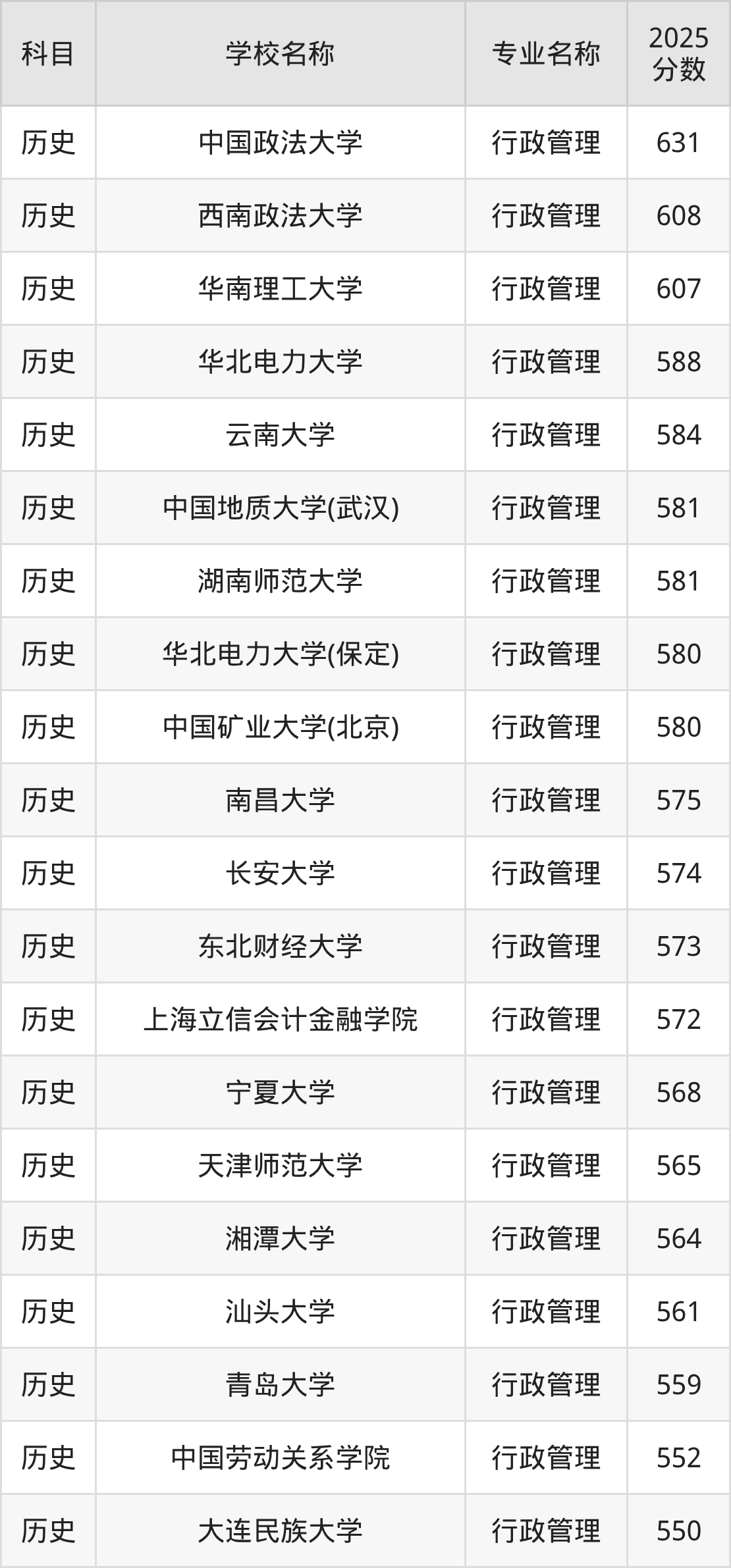 通过上文大家可以知晓,在吉林省内招行政管理专业的院校数量较少,所以下文将为2026届高考生继续展示:省外大学的行政管理专业2025年在吉林高考的录取情况,包含中国政法大学、西南政法大学、华南理工大学、华北电力大学、云南大学。