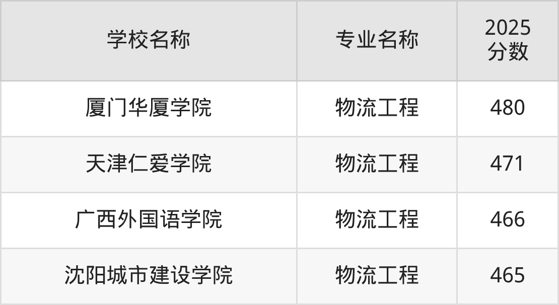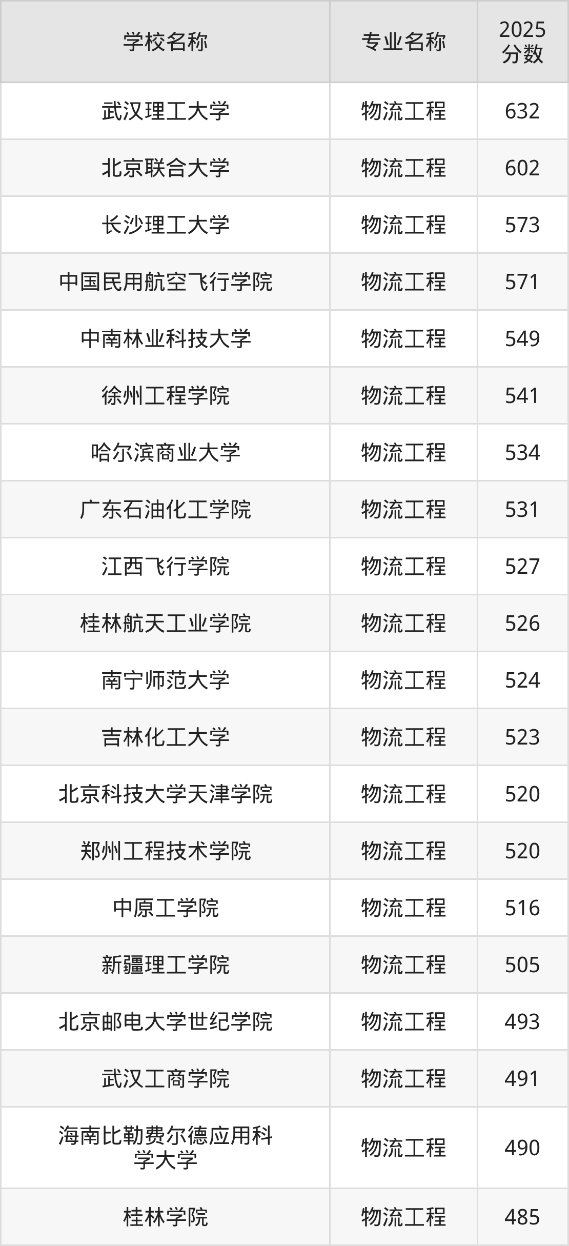 通过上文大家可以知晓,在浙江省内招物流工程专业的院校数量较少,所以下文将为2026届高考生继续展示:省外大学的物流工程专业2025年在浙江高考的录取情况,包含武汉理工大学、北京联合大学、长沙理工大学、中国民用航空飞行学院、中南林业科技大学。
