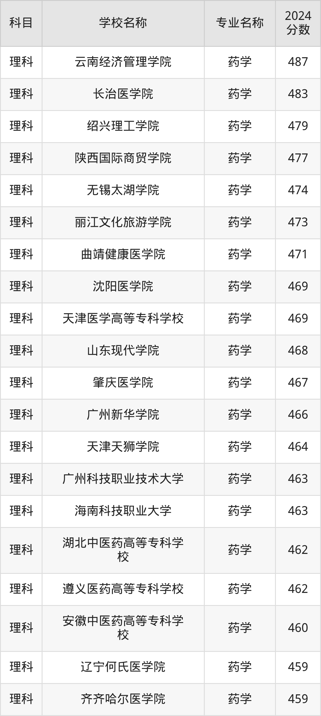 | 四川中医药高等专科学 校 | 药学 | 469 |