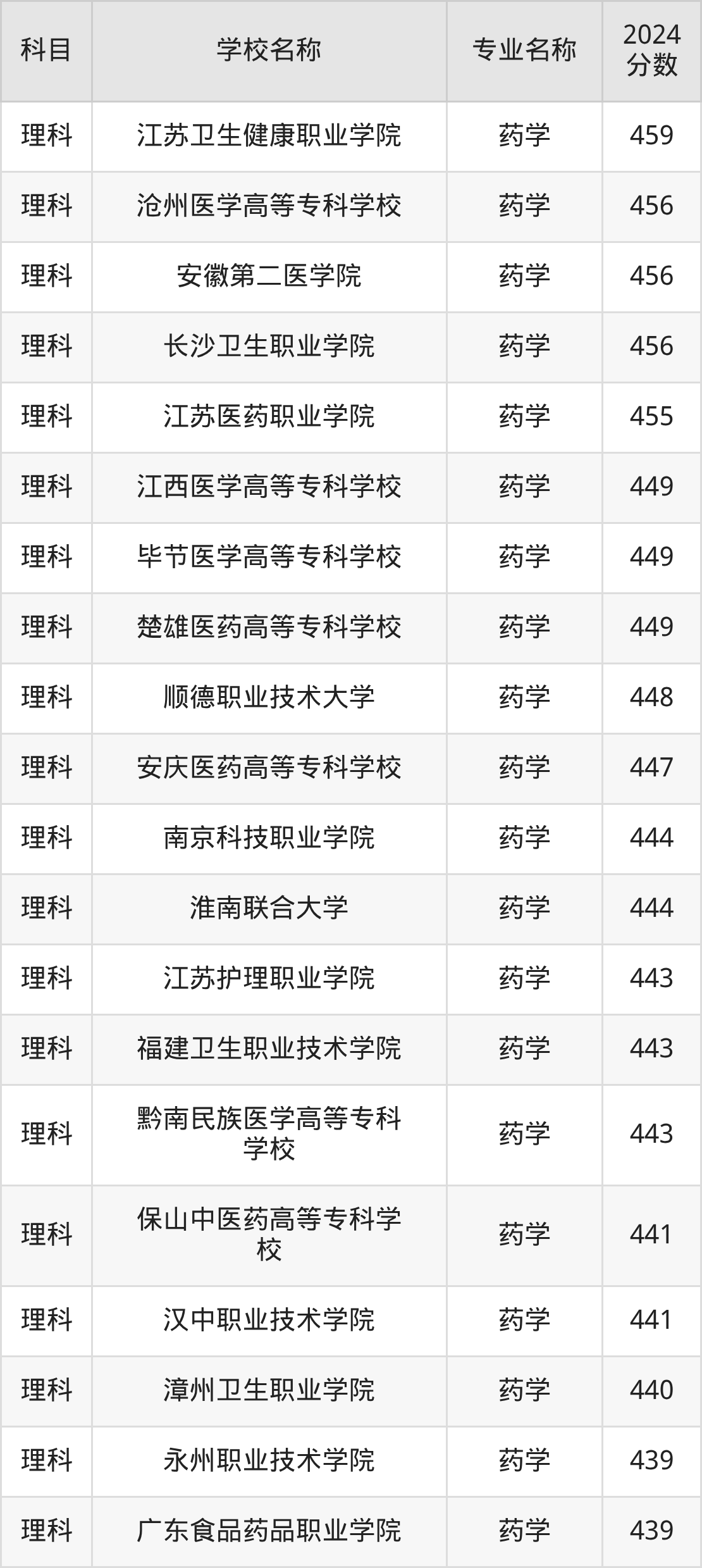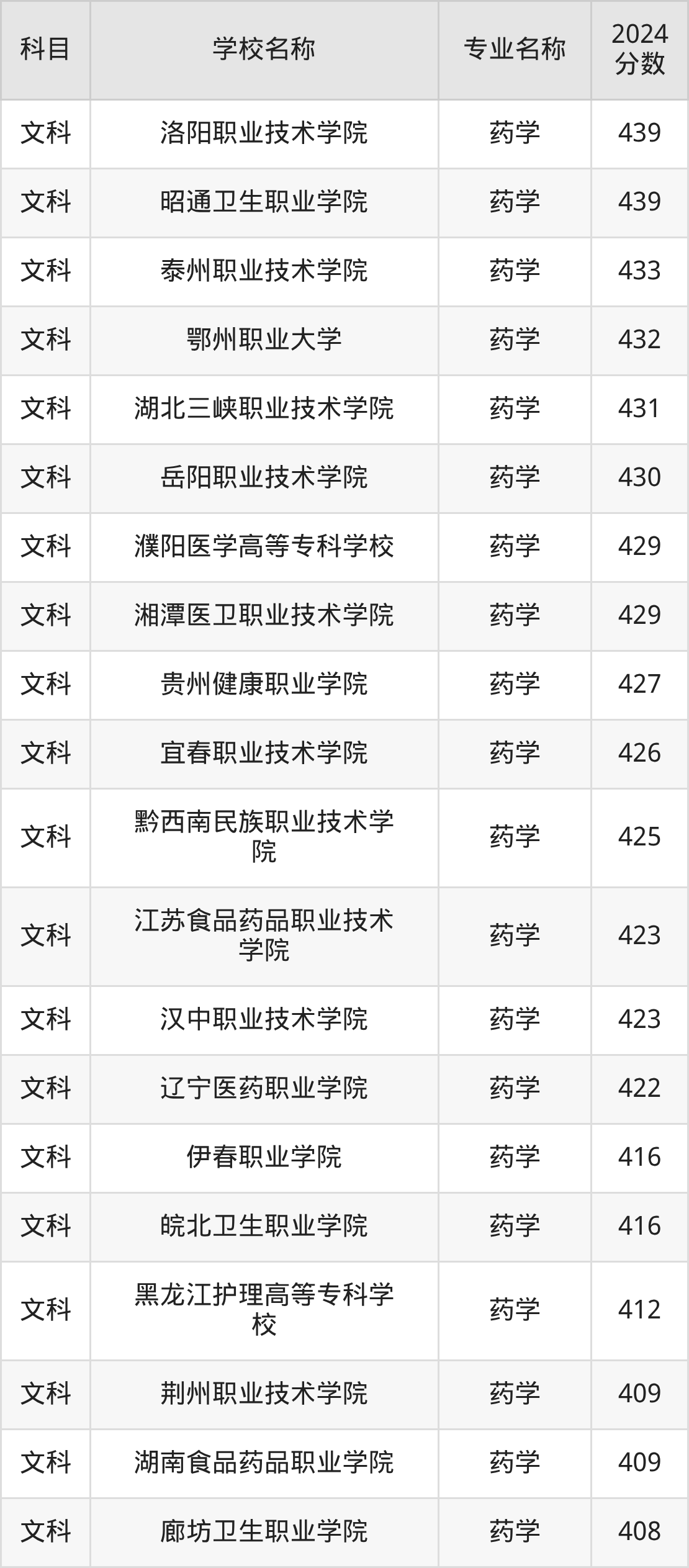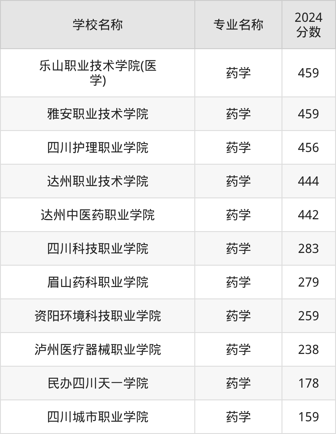 | 四川卫生康复职业学院 | 药学 | 458 |