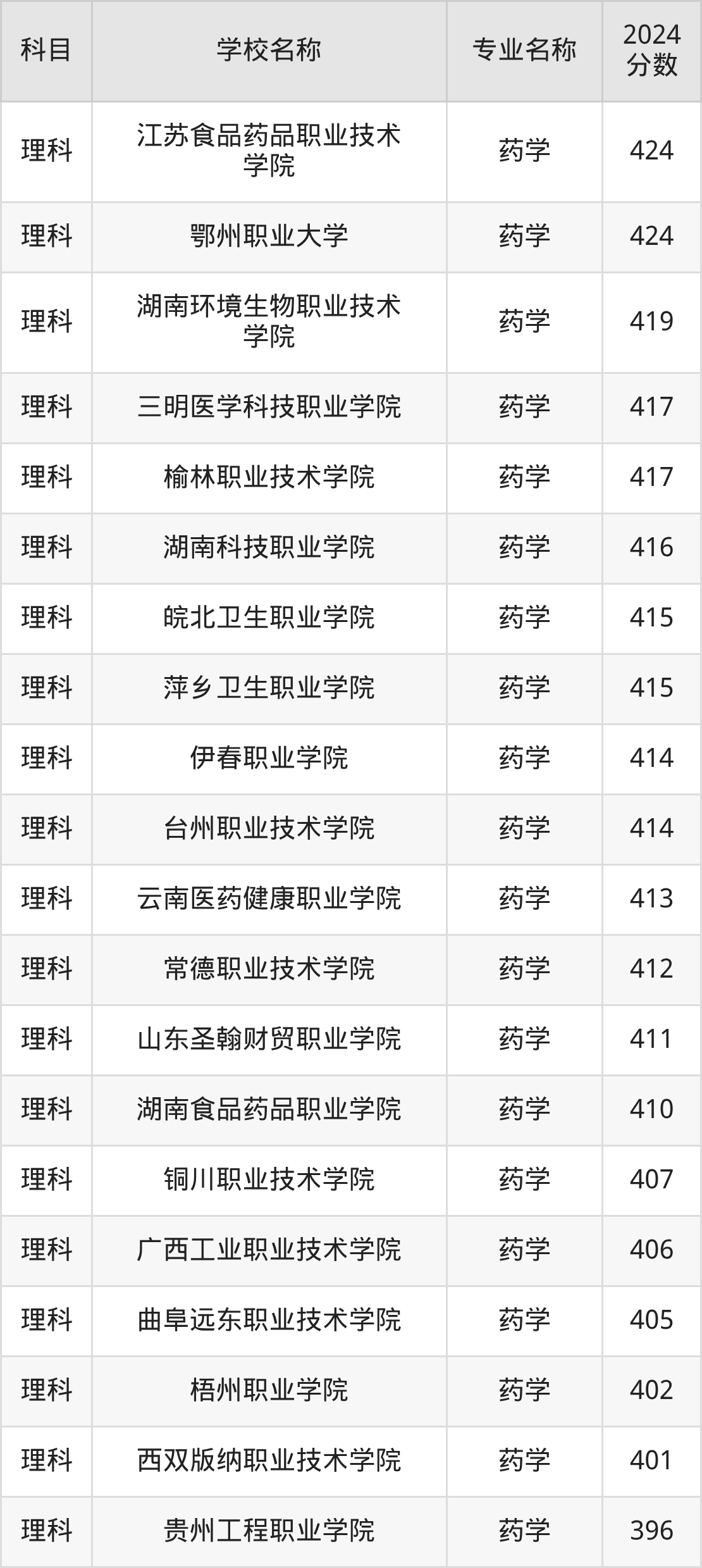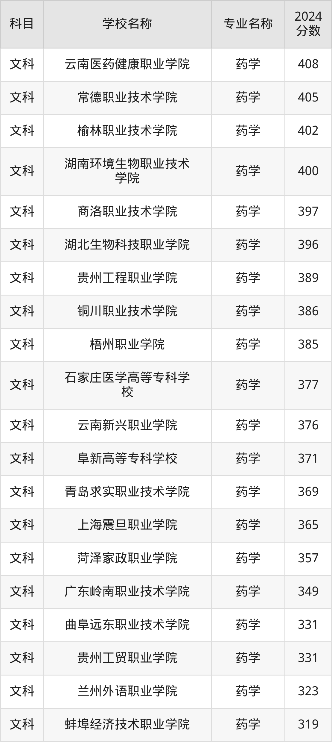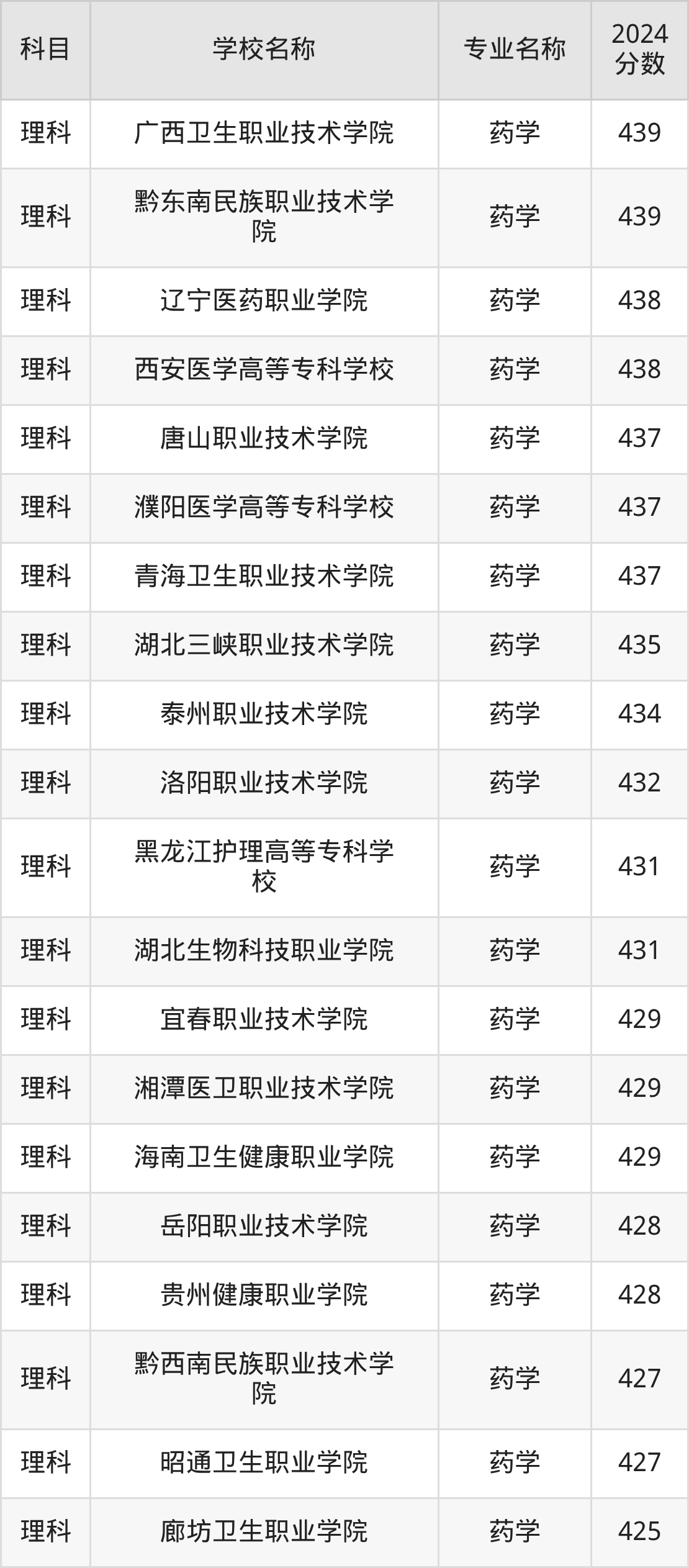 | 四川卫生康复职业学院 | 药学 | 458 |