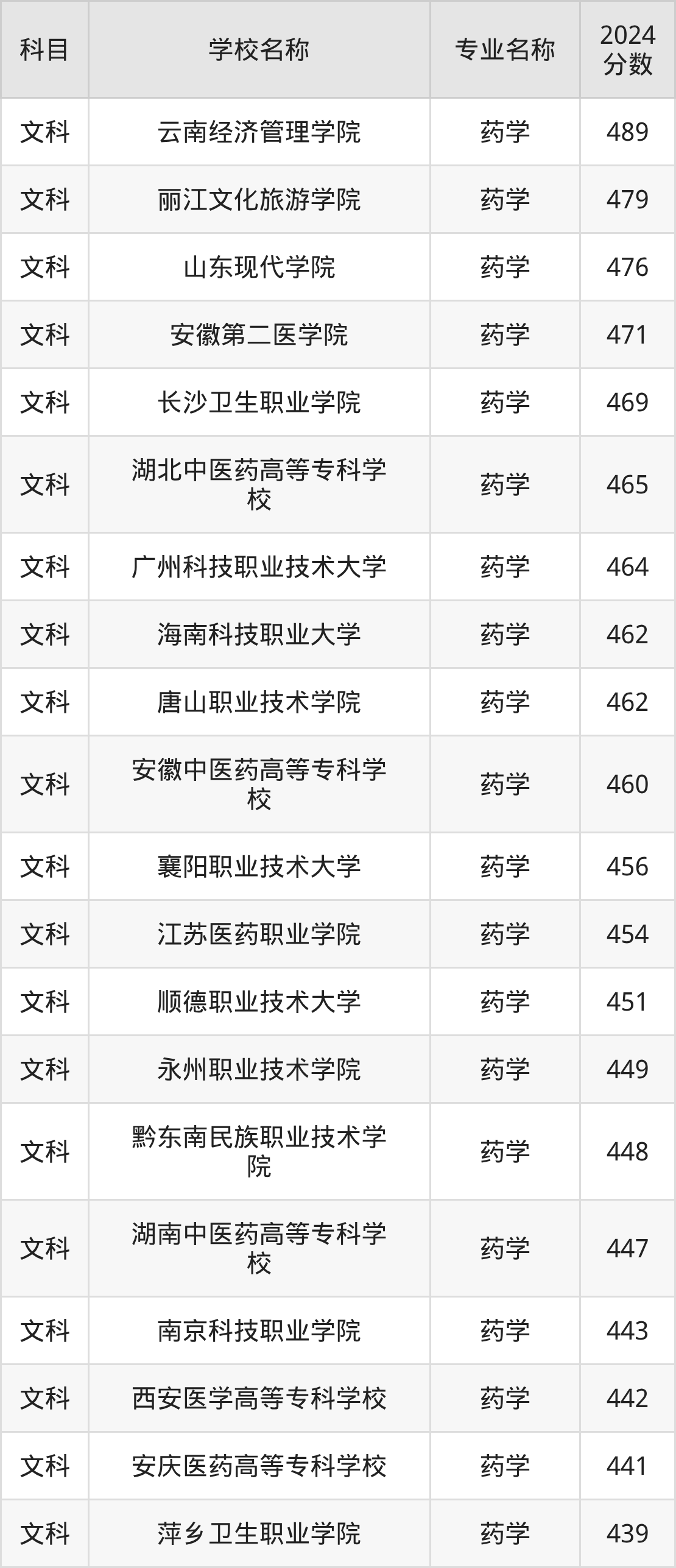 通过上文大家可以知晓,在四川省内招药学专业的院校数量较少,所以下文将为2026届高考生继续展示:省外大学的药学专业2024年在四川高考的录取情况,包含云南经济管理学院、丽江文化旅游学院、山东现代学院、安徽第二医学院、长沙卫生职业学院。