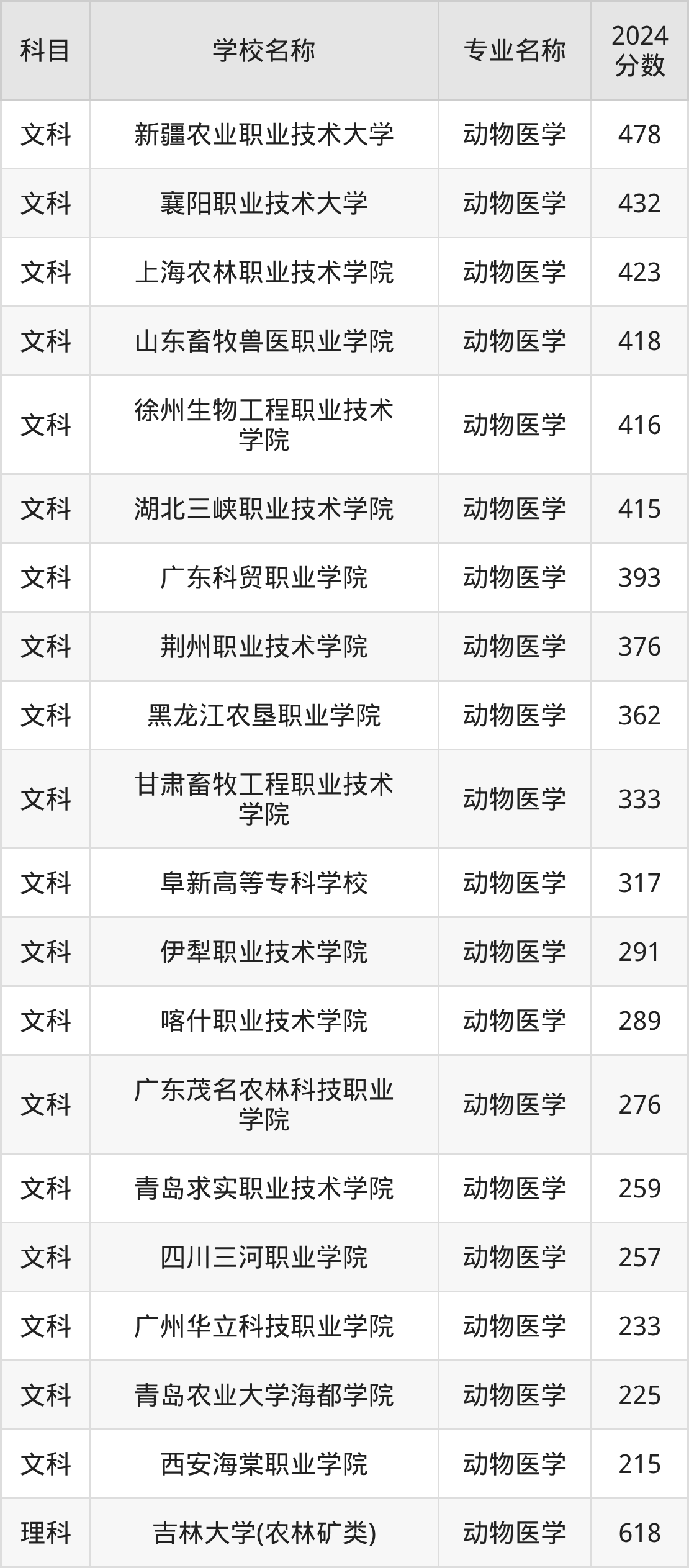 通过上文大家可以知晓,在河南省内招动物医学专业的院校数量较少,所以下文将为2026届高考生继续展示:省外大学的动物医学专业2024年在河南高考的录取情况,包含新疆农业职业技术大学、襄阳职业技术大学、上海农林职业技术学院、山东畜牧兽医职业学院、徐州生物工程职业技术学院。