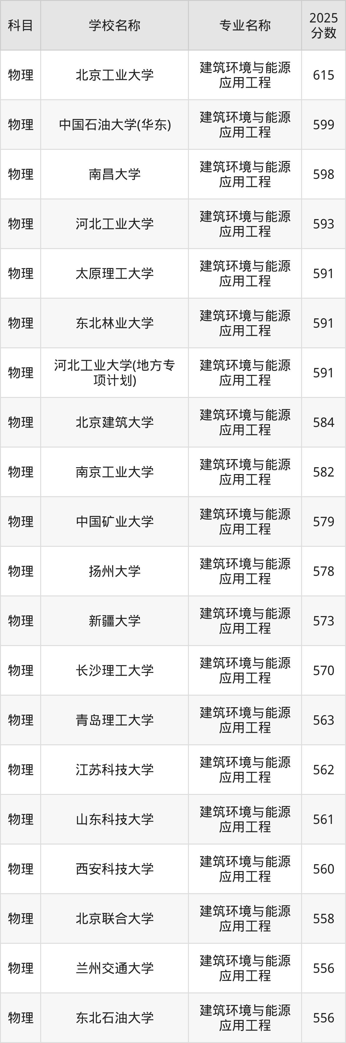 通过上文大家可以知晓,在河北省内招建筑环境与能源应用工程专业的院校数量较少,所以下文将为2026届高考生继续展示:省外大学的建筑环境与能源应用工程专业2025年在河北高考的录取情况,包含北京工业大学、中国石油大学(华东)、南昌大学、河北工业大学、太原理工大学。