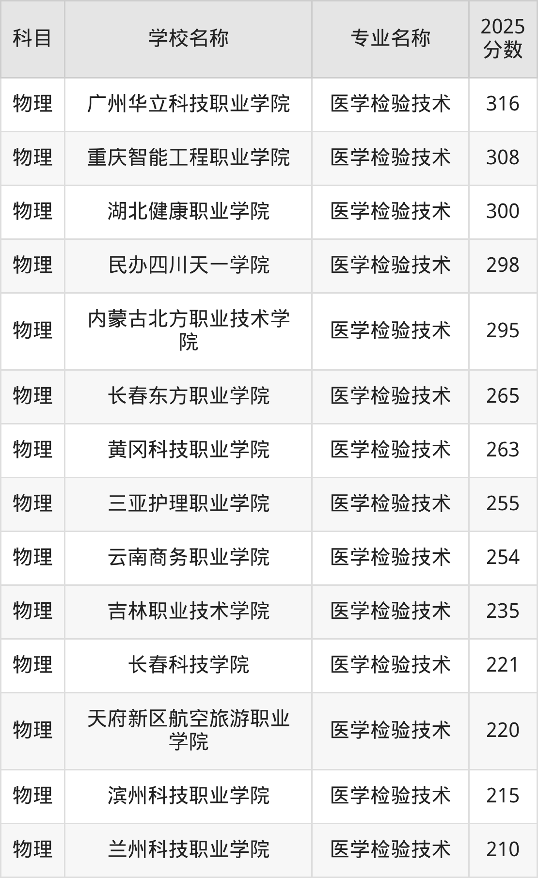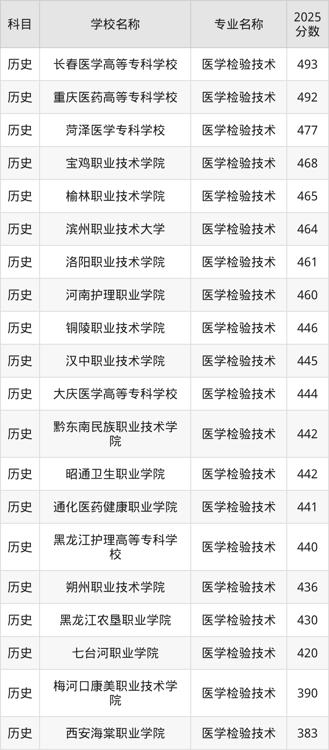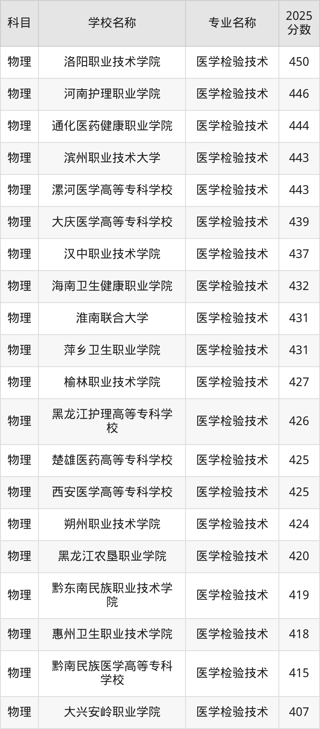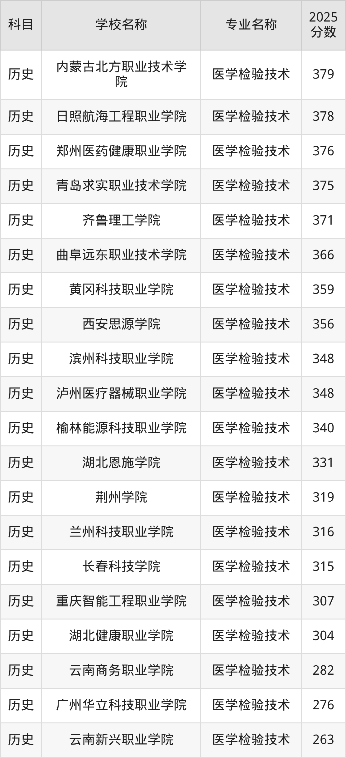 | 渤海理工职业学院 | 医学检验技术 | 370 |