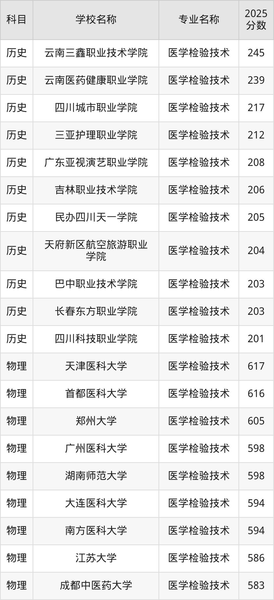 通过上文大家可以知晓,在河北省内招医学检验技术专业的院校数量较少,所以下文将为2026届高考生继续展示:省外大学的医学检验技术专业2025年在河北高考的录取情况,包含长春医学高等专科学校、重庆医药高等专科学校、菏泽医学专科学校、宝鸡职业技术学院、榆林职业技术学院。