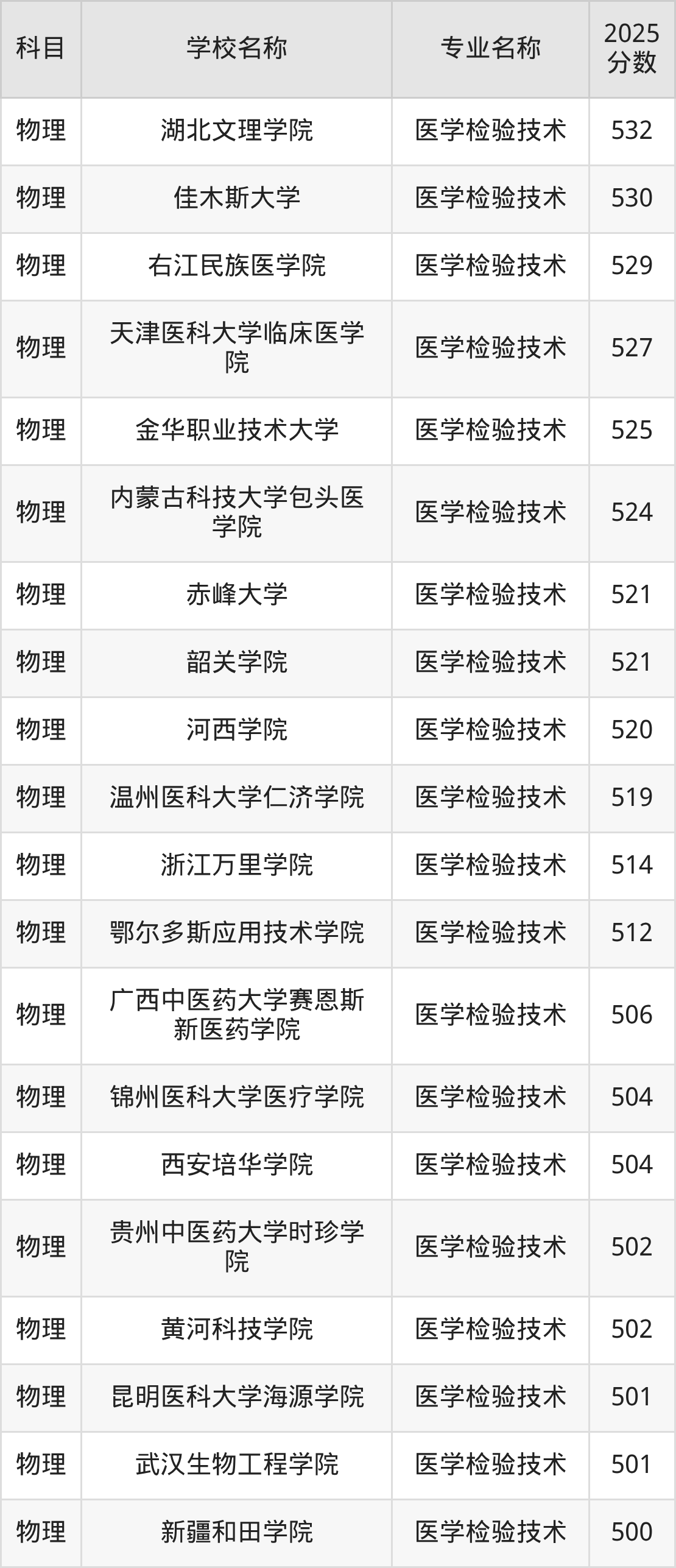 圆梦小编根据河北2025年高考物理组专业分,将开设了医学检验技术专业且位于河北省内的大学按照“录取分”从高到低排序,得出了以上榜单。