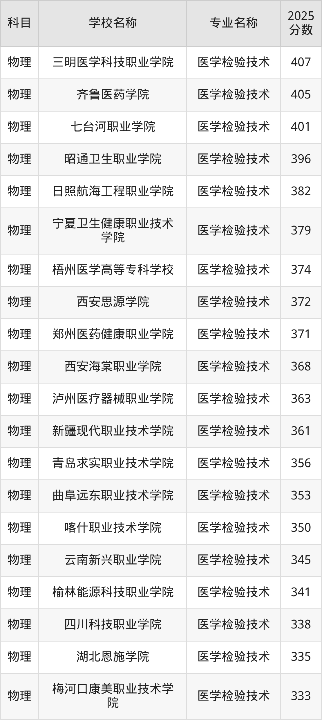 | 石家庄科技信息职业学 院 | 医学检验技术 | 381 |