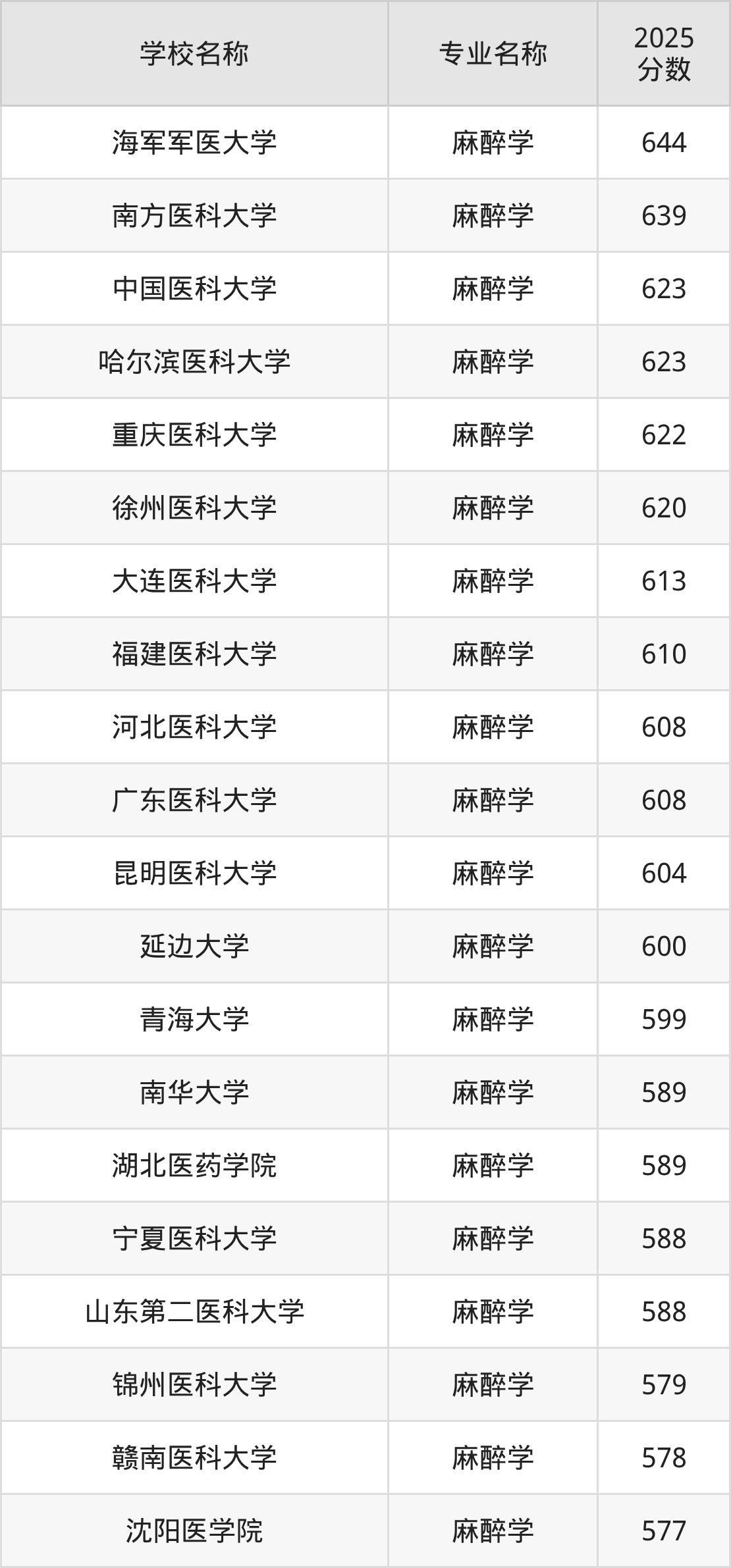 通过上文大家可以知晓,在浙江省内招麻醉学专业的院校数量较少,所以下文将为2026届高考生继续展示:省外大学的麻醉学专业2025年在浙江高考的录取情况,包含海军军医大学、南方医科大学、中国医科大学、哈尔滨医科大学、重庆医科大学。