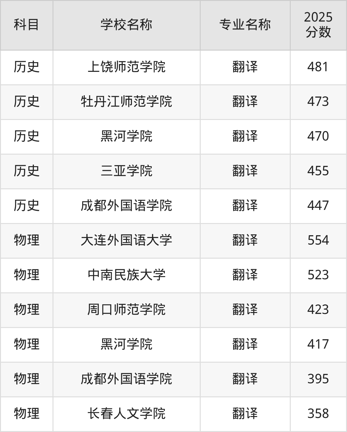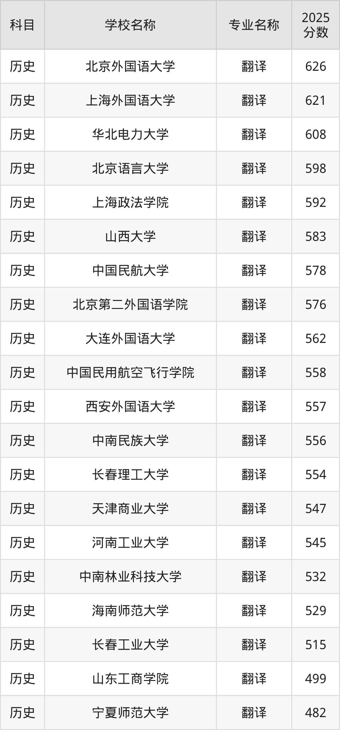 | 呼和浩特民族学院 | 翻译(英语) | 470 |