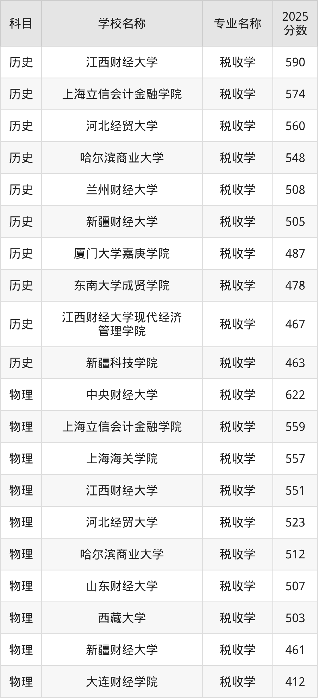 通过上文大家可以知晓,在吉林省内招税收学专业的院校数量较少,所以下文将为2026届高考生继续展示:省外大学的税收学专业2025年在吉林高考的录取情况,包含江西财经大学、上海立信会计金融学院、河北经贸大学、哈尔滨商业大学、兰州财经大学。