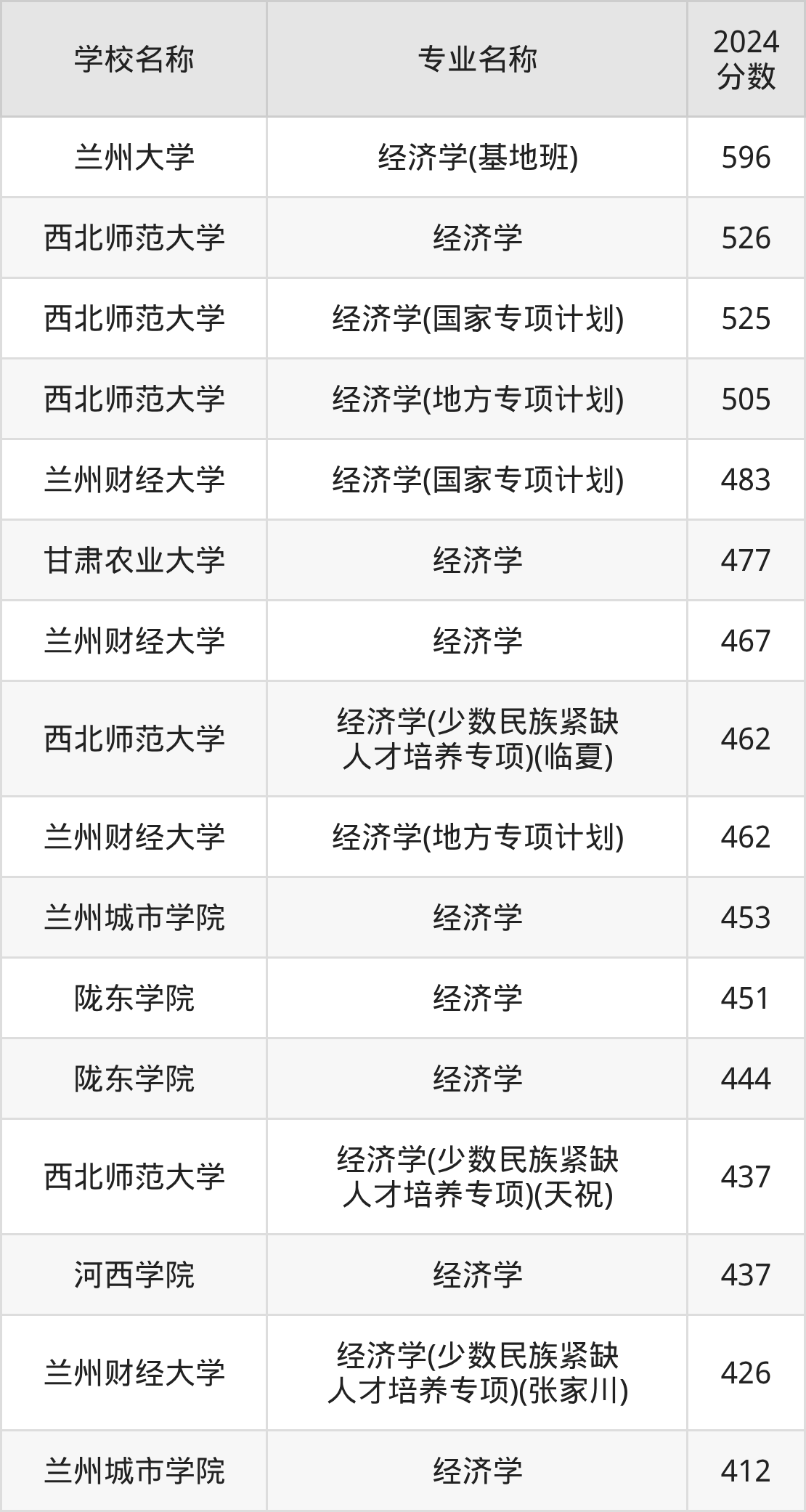 圆梦小编根据甘肃2024年高考历史组专业分,将开设了经济学专业且位于甘肃省内的大学按照“录取分”从高到低排序,得出了以上榜单。