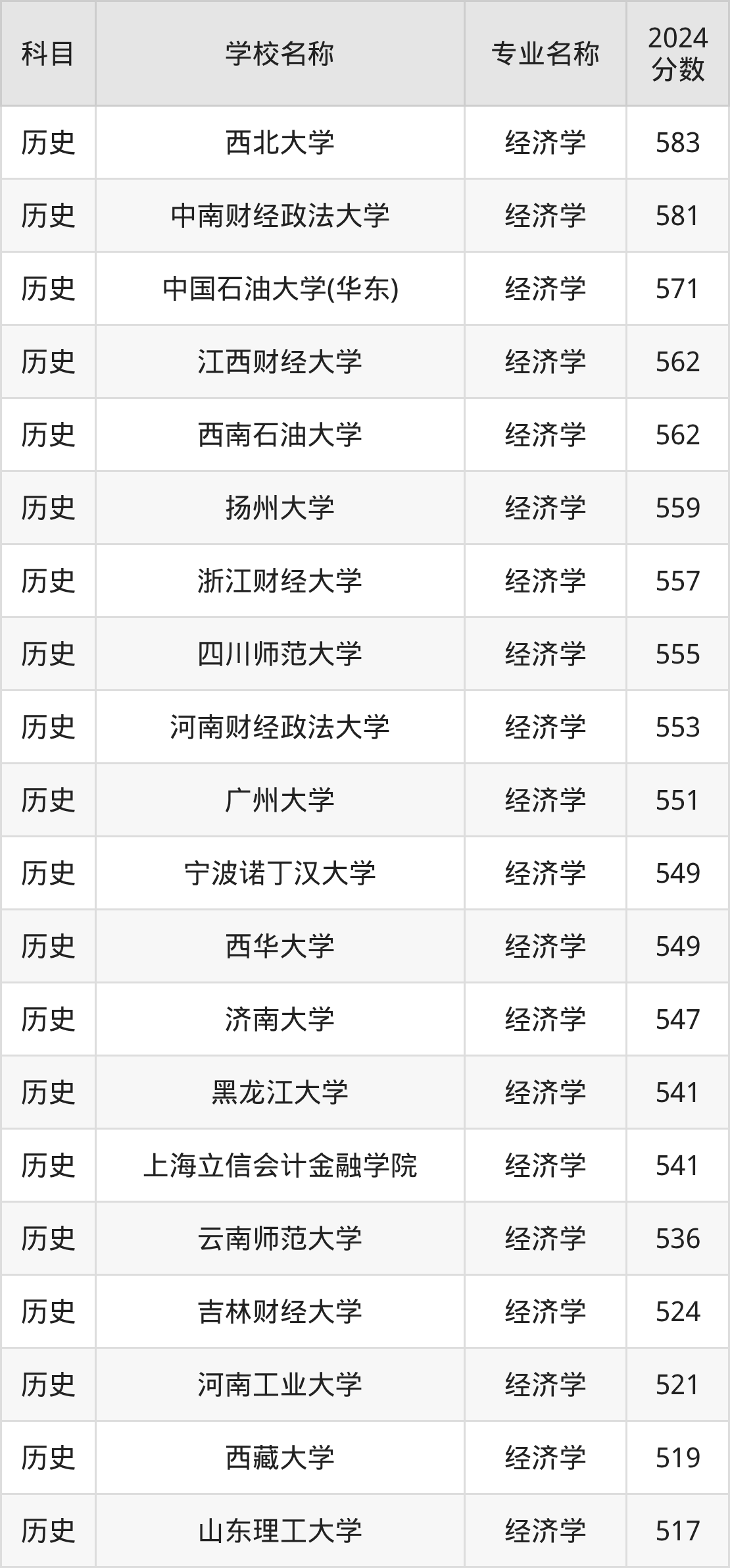 通过上文大家可以知晓,在甘肃省内招经济学专业的院校数量较少,所以下文将为2026届高考生继续展示:省外大学的经济学专业2024年在甘肃高考的录取情况,包含西北大学、中南财经政法大学、中国石油大学(华东)、江西财经大学、西南石油大学。