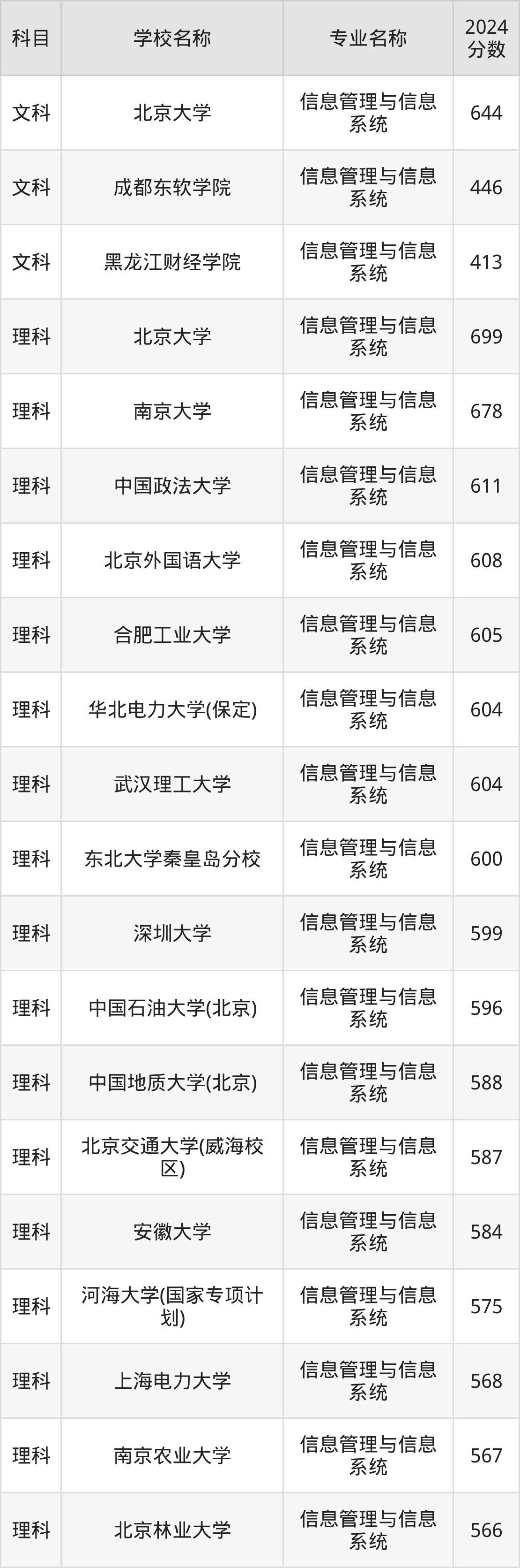 通过上文大家可以知晓,在陕西省内招信息管理与信息系统专业的院校数量较少,所以下文将为2026届高考生继续展示:省外大学的信息管理与信息系统专业2024年在陕西高考的录取情况,包含北京大学、成都东软学院、黑龙江财经学院、南京大学、中国政法大学。