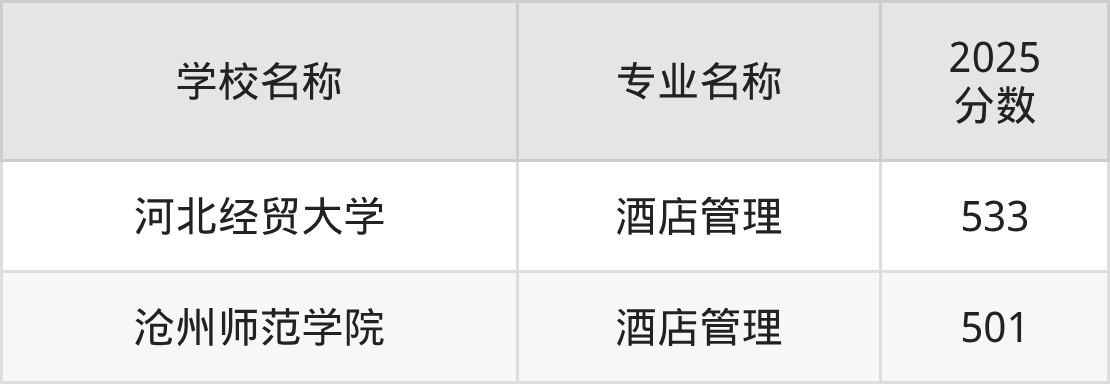圆梦小编根据河北2025年高考历史组专业分,将开设了酒店管理专业且位于河北省内的大学按照“录取分”从高到低排序,得出了以上榜单。