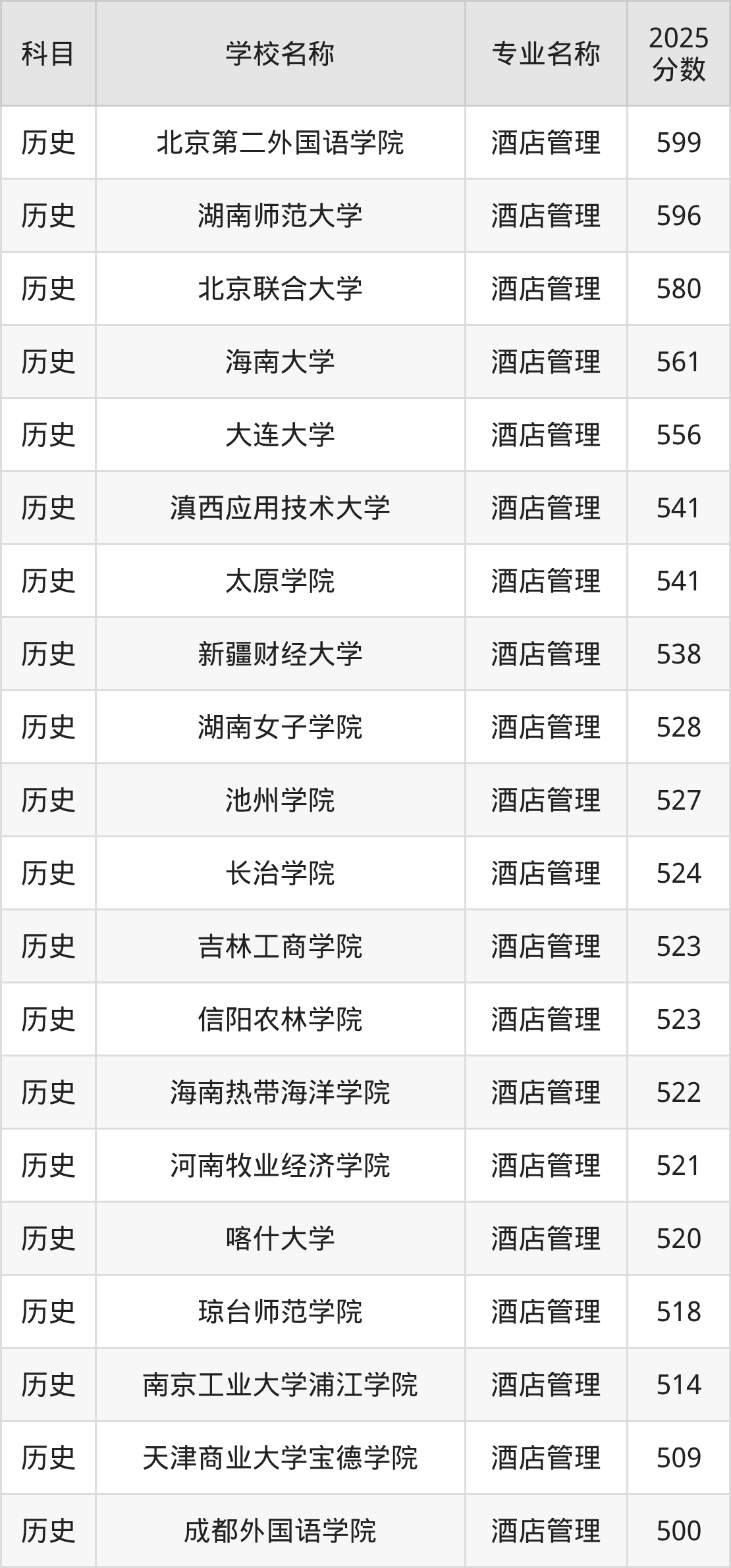 通过上文大家可以知晓,在河北省内招酒店管理专业的院校数量较少,所以下文将为2026届高考生继续展示:省外大学的酒店管理专业2025年在河北高考的录取情况,包含北京第二外国语学院、湖南师范大学、北京联合大学、海南大学、大连大学。
