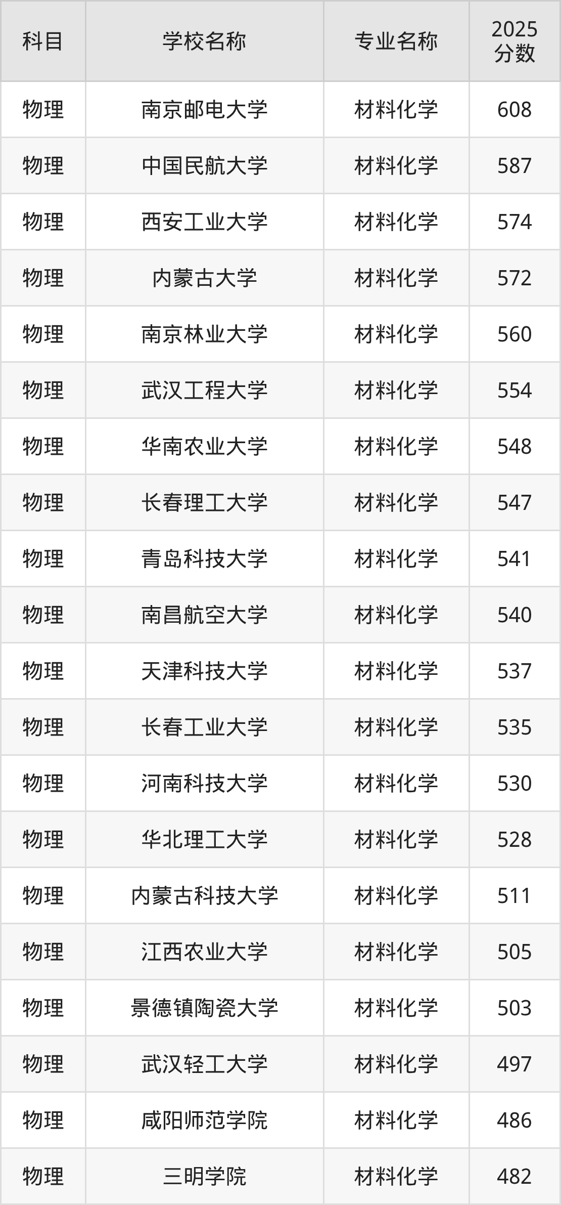 通过上文大家可以知晓,在山西省内招材料化学专业的院校数量较少,所以下文将为2026届高考生继续展示:省外大学的材料化学专业2025年在山西高考的录取情况,包含南京邮电大学、中国民航大学、西安工业大学、内蒙古大学、南京林业大学。
