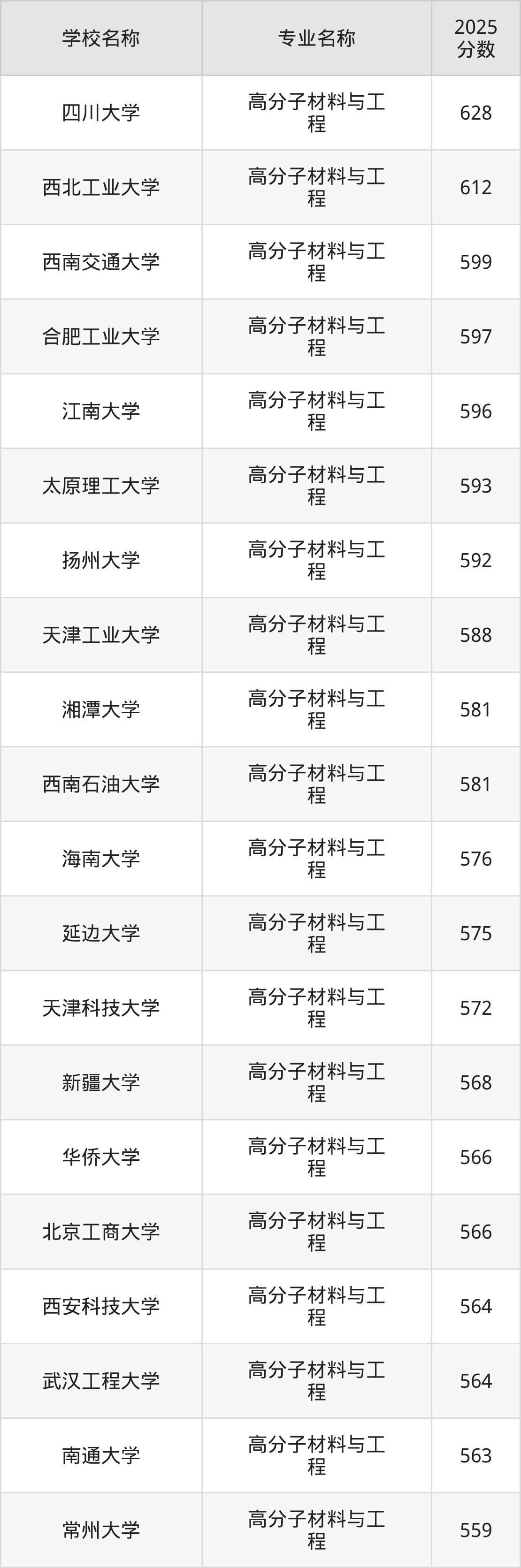通过上文大家可以知晓,在山东省内招高分子材料与工程专业的院校数量较少,所以下文将为2026届高考生继续展示:省外大学的高分子材料与工程专业2025年在山东高考的录取情况,包含四川大学、西北工业大学、西南交通大学、合肥工业大学、江南大学。