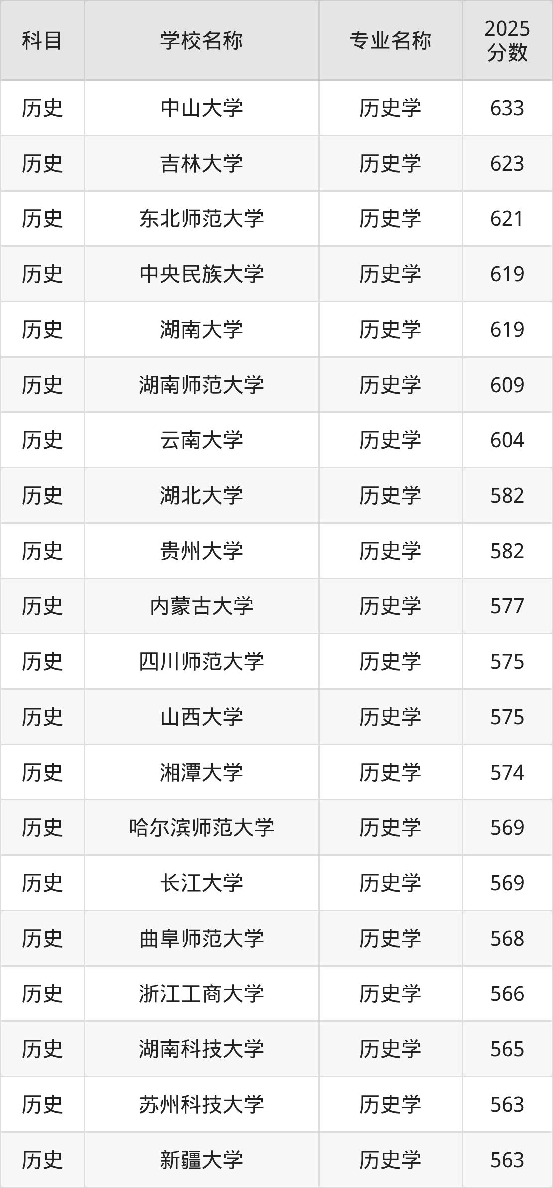 通过上文大家可以知晓,在辽宁省内招历史学专业的院校数量较少,所以下文将为2026届高考生继续展示:省外大学的历史学专业2025年在辽宁高考的录取情况,包含中山大学、吉林大学、东北师范大学、中央民族大学、湖南大学。