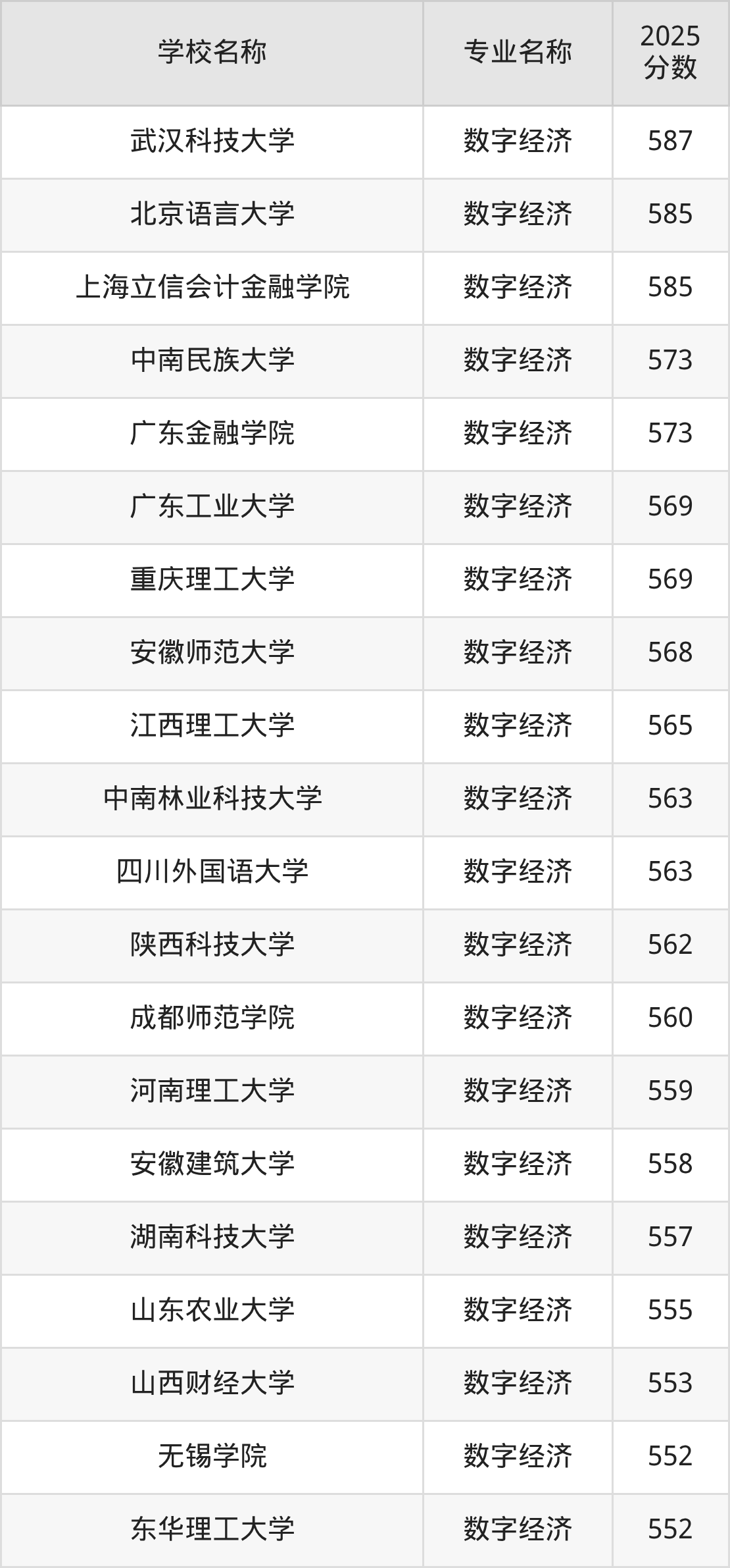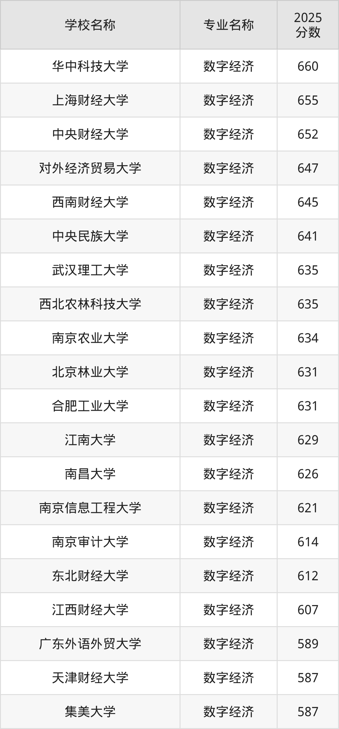 通过上文大家可以知晓,在浙江省内招数字经济专业的院校数量较少,所以下文将为2026届高考生继续展示:省外大学的数字经济专业2025年在浙江高考的录取情况,包含华中科技大学、上海财经大学、中央财经大学、对外经济贸易大学、西南财经大学。