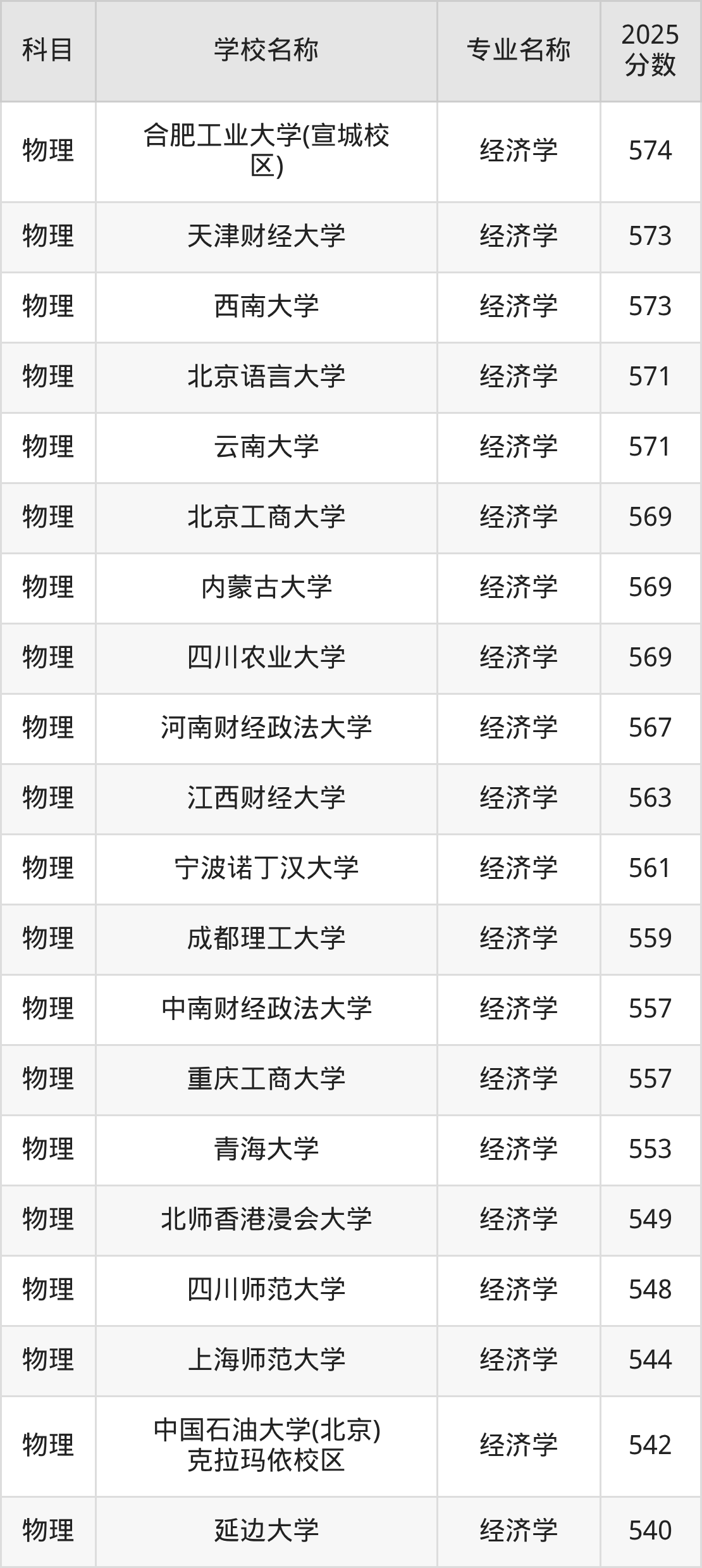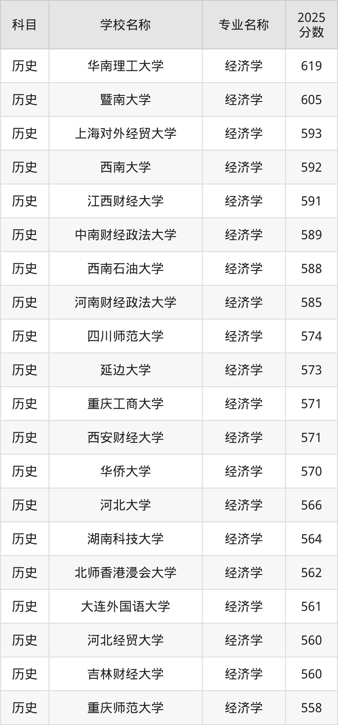 通过上文大家可以知晓,在山西省内招经济学专业的院校数量较少,所以下文将为2026届高考生继续展示:省外大学的经济学专业2025年在山西高考的录取情况,包含华南理工大学、暨南大学、上海对外经贸大学、西南大学、江西财经大学。