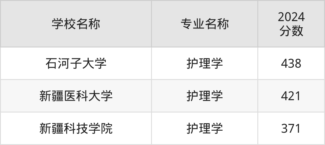 在直接以“护理学”的名称招生的新疆维吾尔自治区大学中,石河子大学的分数线最高、排名第一名,在理科的最低分是397分,全维吾尔自治区排名前17004位的高考生才有较大机会被录取。