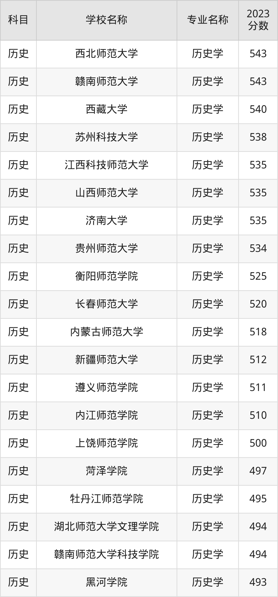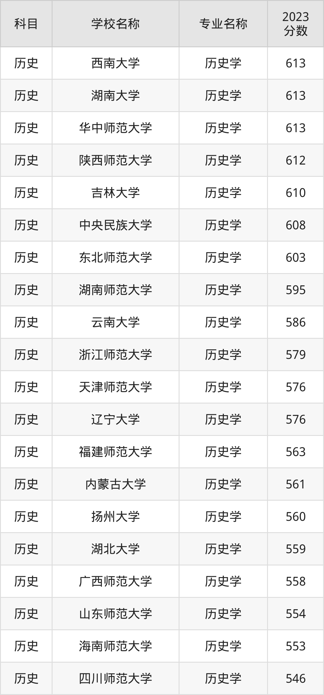 通过上文大家可以知晓,在广东省内招历史学专业的院校数量较少,所以下文将为2025届高考生继续展示:省外大学的历史学专业2023年在广东高考的录取情况,包含西南大学、湖南大学、华中师范大学、陕西师范大学、吉林大学。