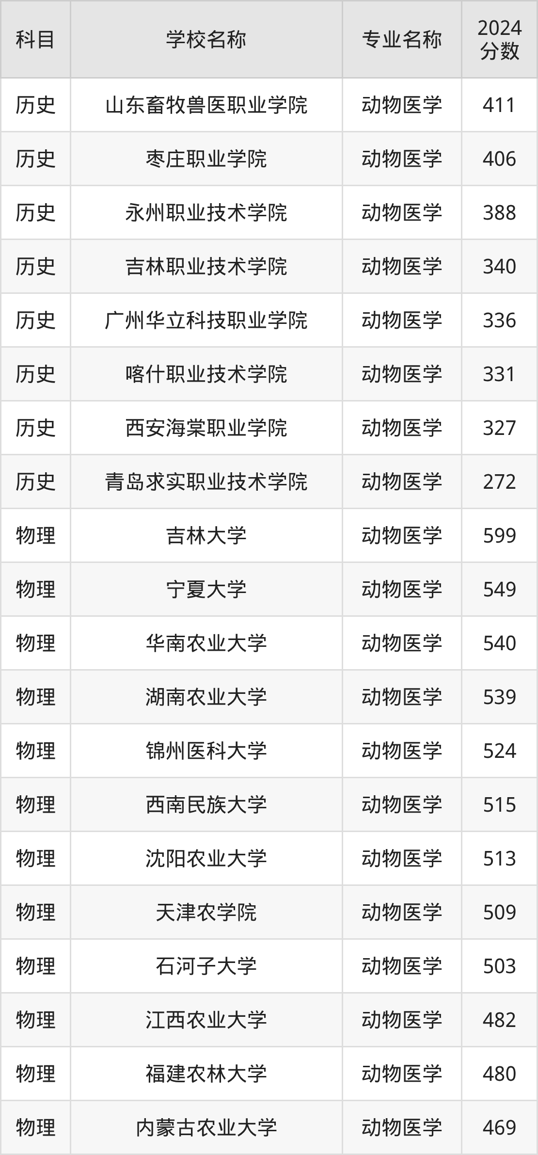 通过上文大家可以知晓,在黑龙江省内招动物医学专业的院校数量较少,所以下文将为2026届高考生继续展示:省外大学的动物医学专业2024年在黑龙江高考的录取情况,包含山东畜牧兽医职业学院、枣庄职业学院、永州职业技术学院、吉林职业技术学院、广州华立科技职业学院。