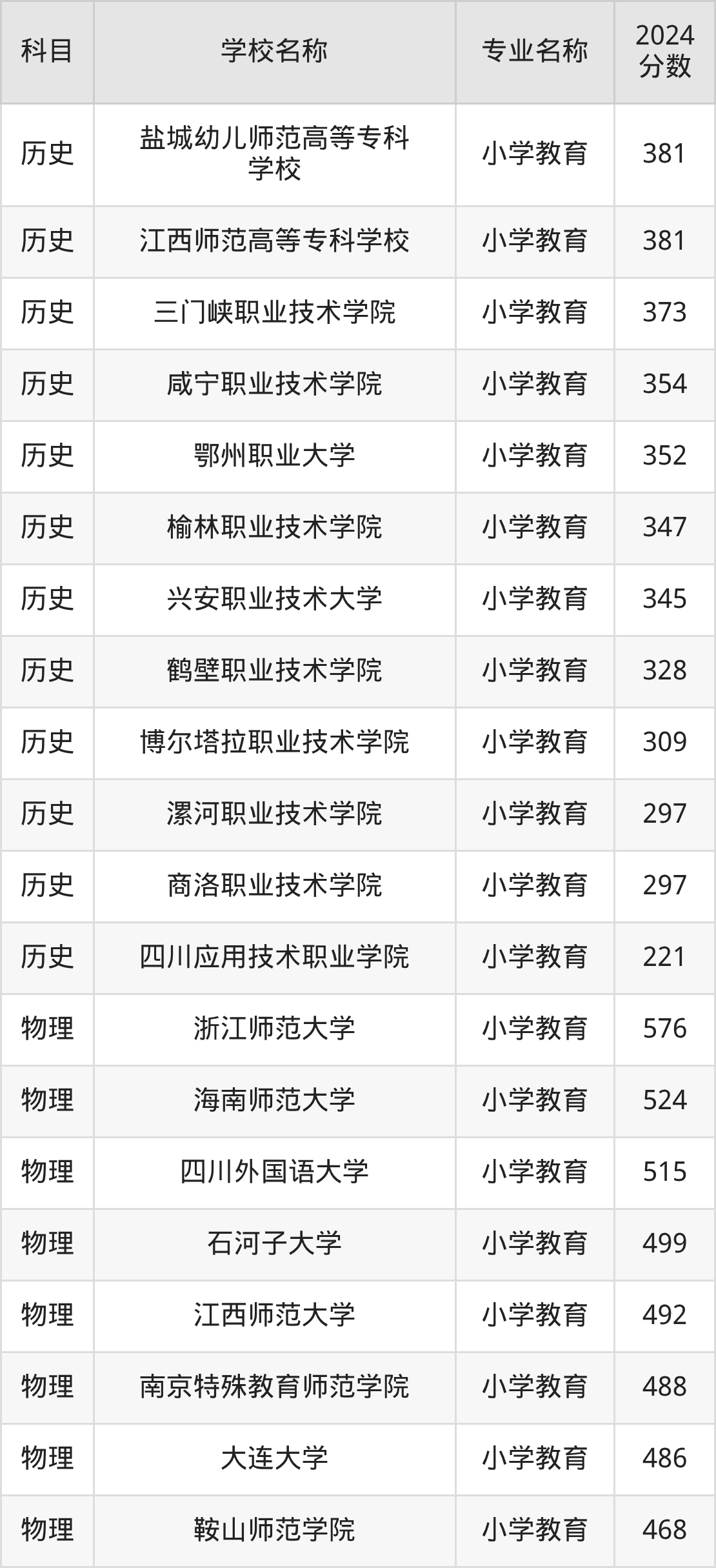 在直接以“小学教育”的名称招生的黑龙江省大学中,牡丹江师范学院的分数线最高、排名第一名,在历史组的最低分是534分,全省排名前5544位的高考生才有较大机会被录取。