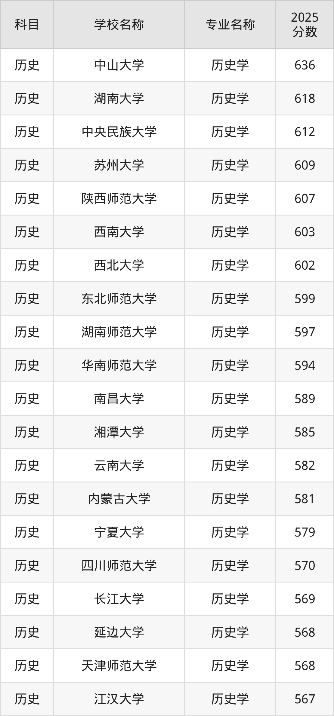 通过上文大家可以知晓,在山西省内招历史学专业的院校数量较少,所以下文将为2026届高考生继续展示:省外大学的历史学专业2025年在山西高考的录取情况,包含中山大学、湖南大学、中央民族大学、苏州大学、陕西师范大学。
