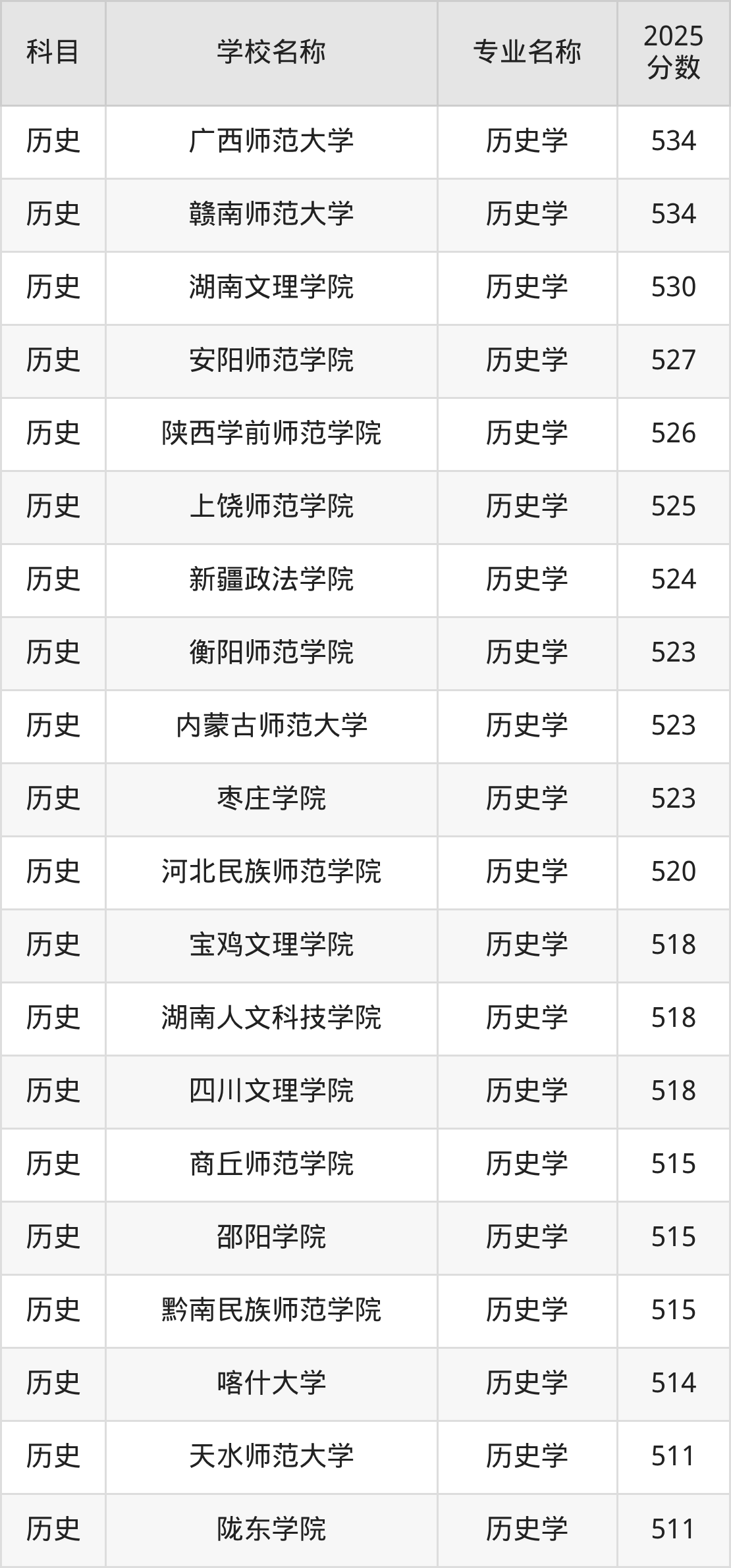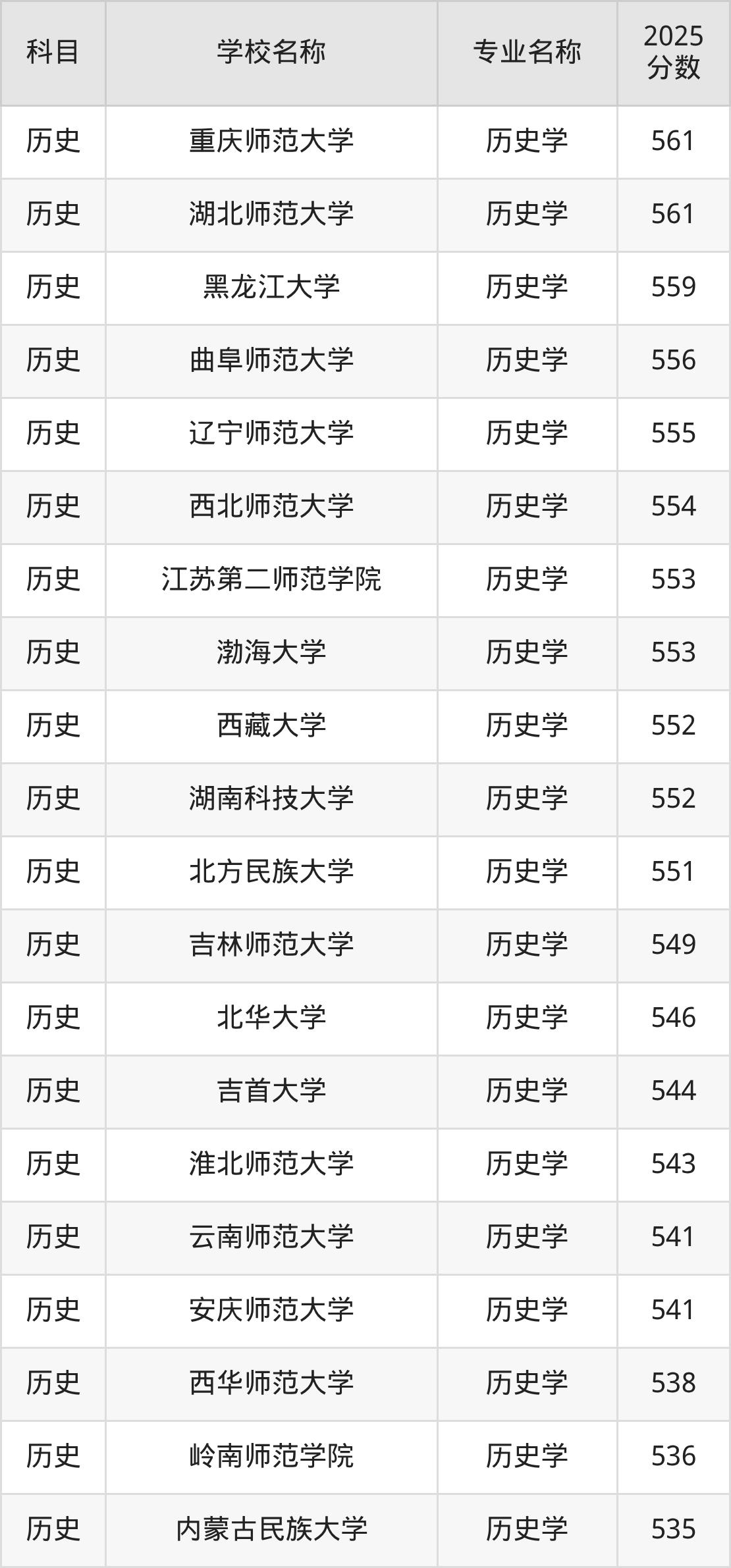 | 山西师范大学 | 历史学(师范类) | 540 |