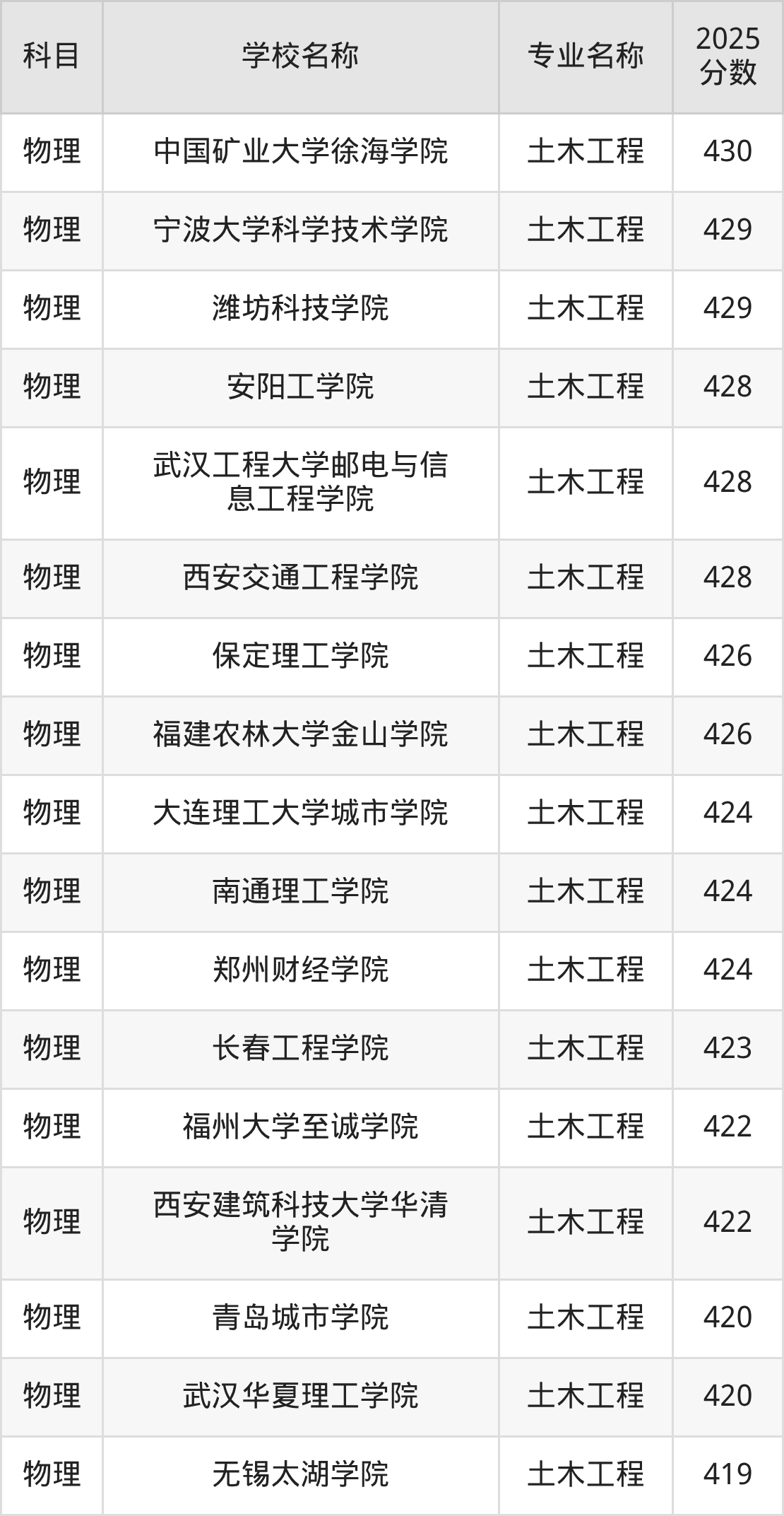 | 山西应用科技学院 | 土木工程 | 419 |