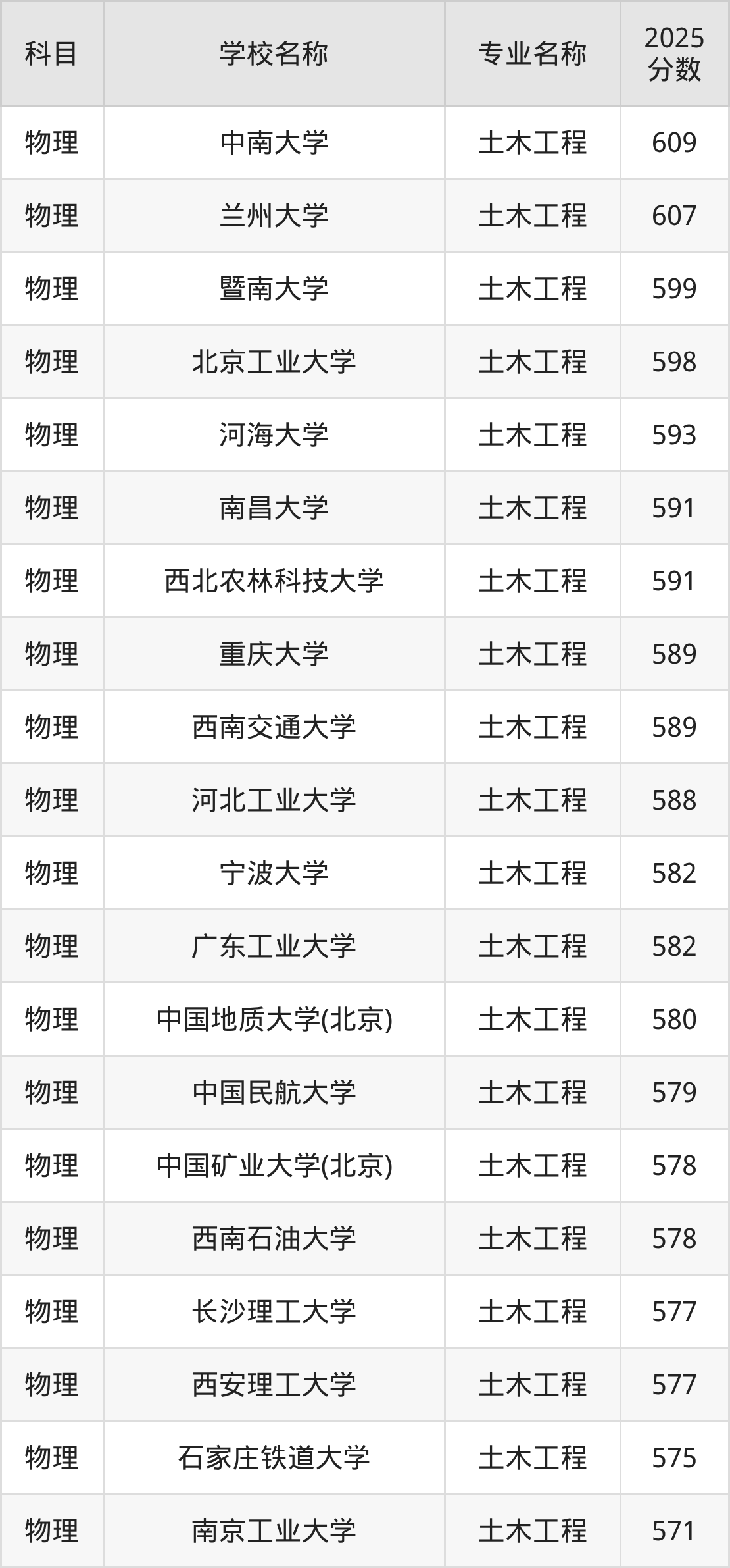 通过上文大家可以知晓,在山西省内招土木工程专业的院校数量较少,所以下文将为2026届高考生继续展示:省外大学的土木工程专业2025年在山西高考的录取情况,包含中南大学、兰州大学、暨南大学、北京工业大学、河海大学。