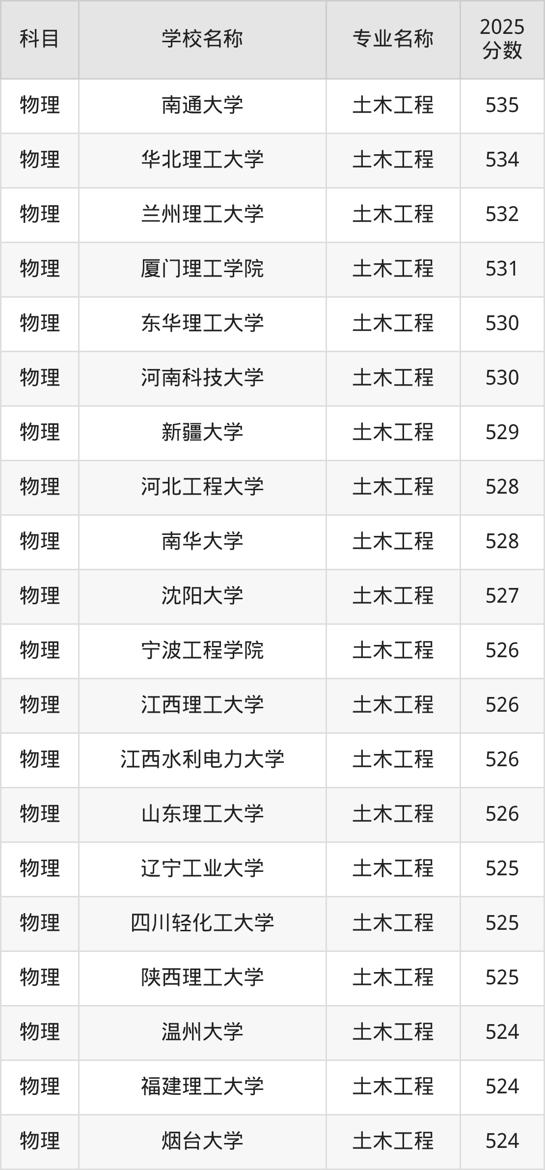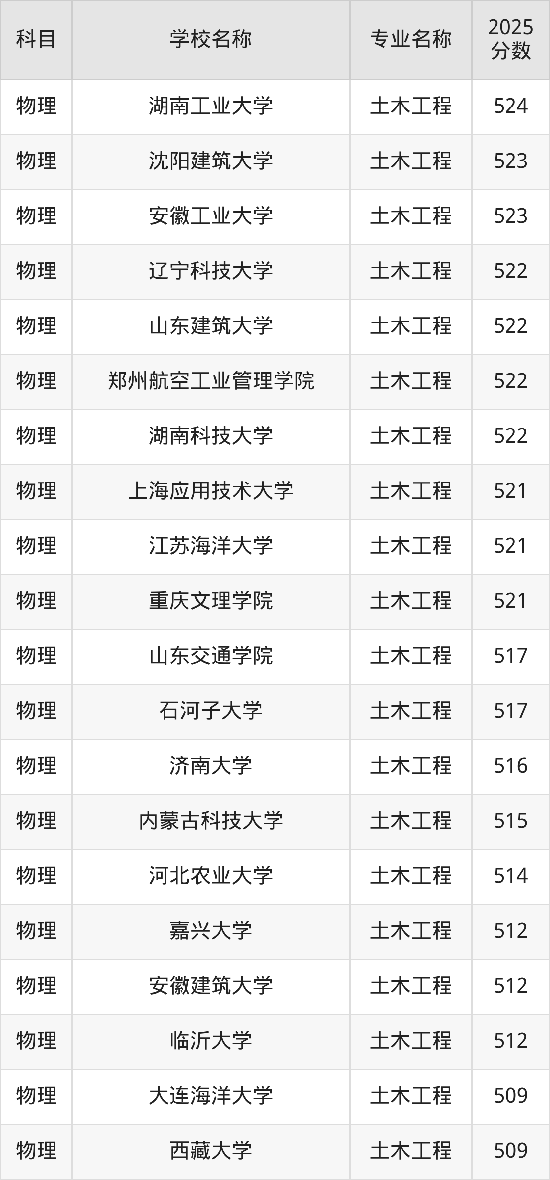 | 山西大学 | 土木工程 | 525 |