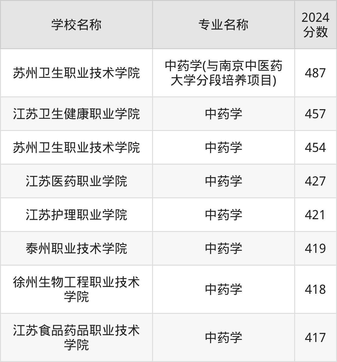 | 苏州卫生职业技术学院 | 中药学(与南京 中医药大学分段 培养项目) | 488 |