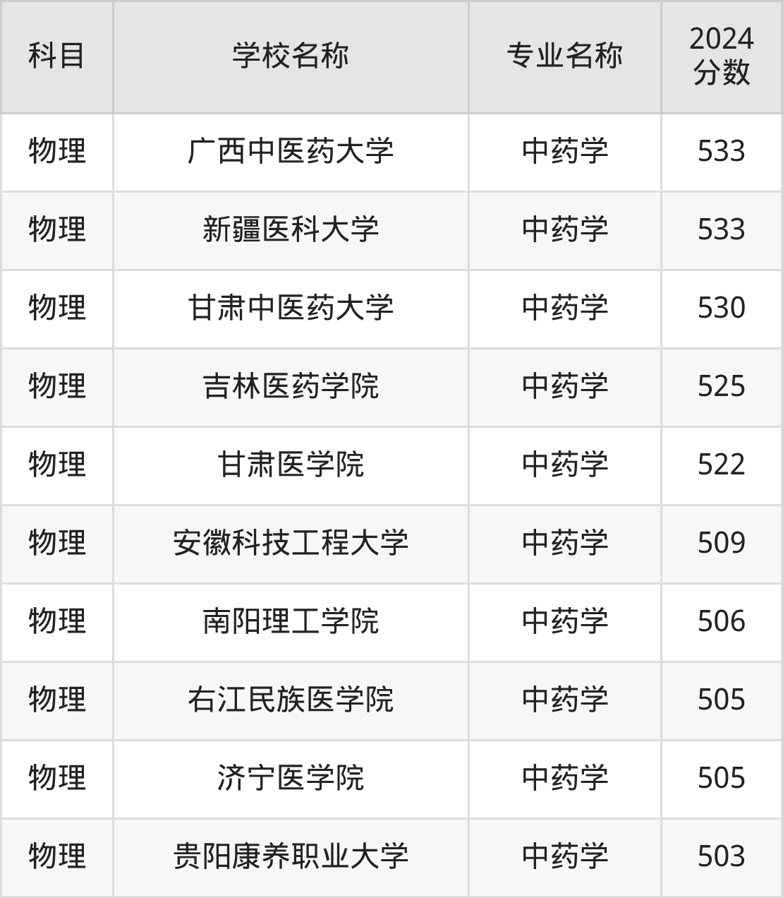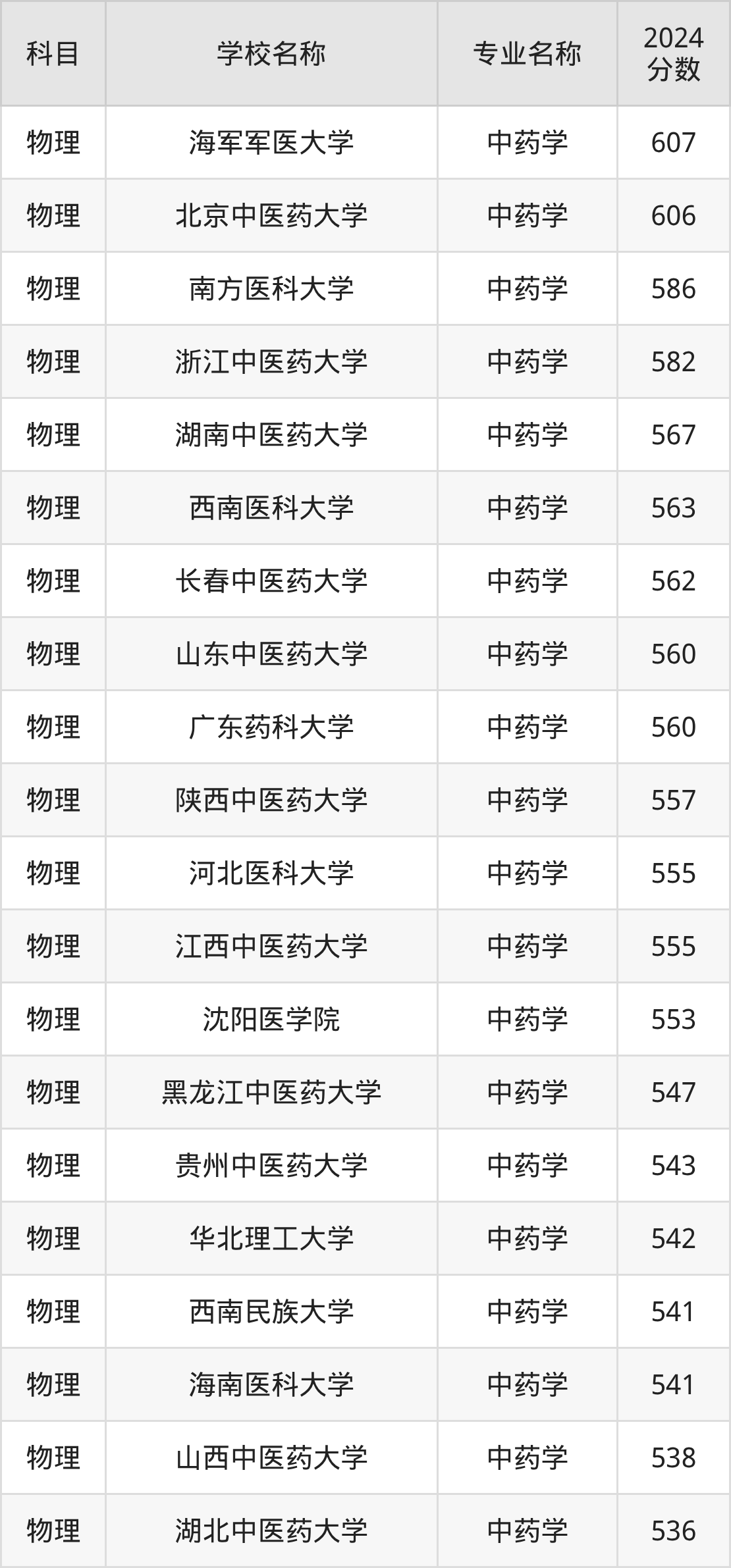 通过上文大家可以知晓,在江苏省内招中药学专业的院校数量较少,所以下文将为2026届高考生继续展示:省外大学的中药学专业2024年在江苏高考的录取情况,包含海军军医大学、北京中医药大学、南方医科大学、浙江中医药大学、湖南中医药大学。