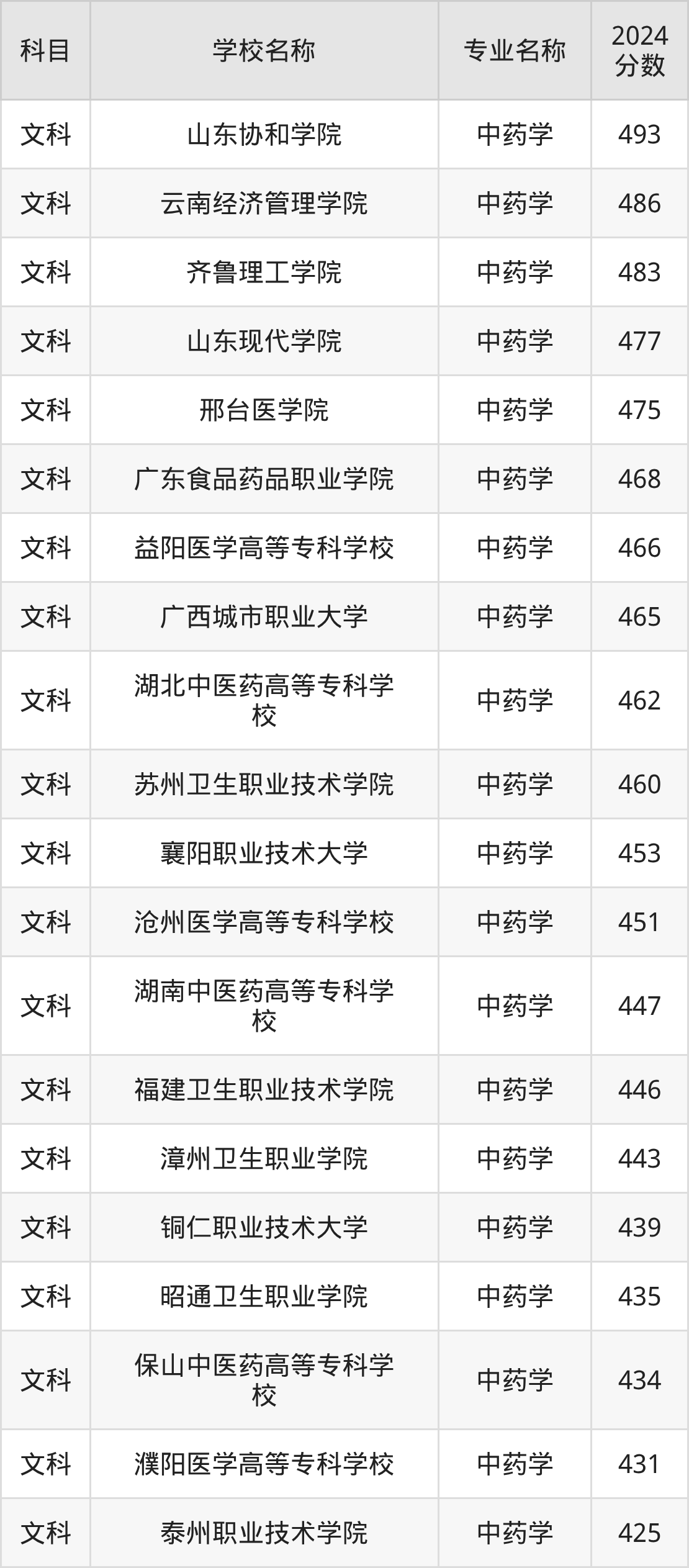 通过上文大家可以知晓,在四川省内招中药学专业的院校数量较少,所以下文将为2026届高考生继续展示:省外大学的中药学专业2024年在四川高考的录取情况,包含山东协和学院、云南经济管理学院、齐鲁理工学院、山东现代学院、邢台医学院。
