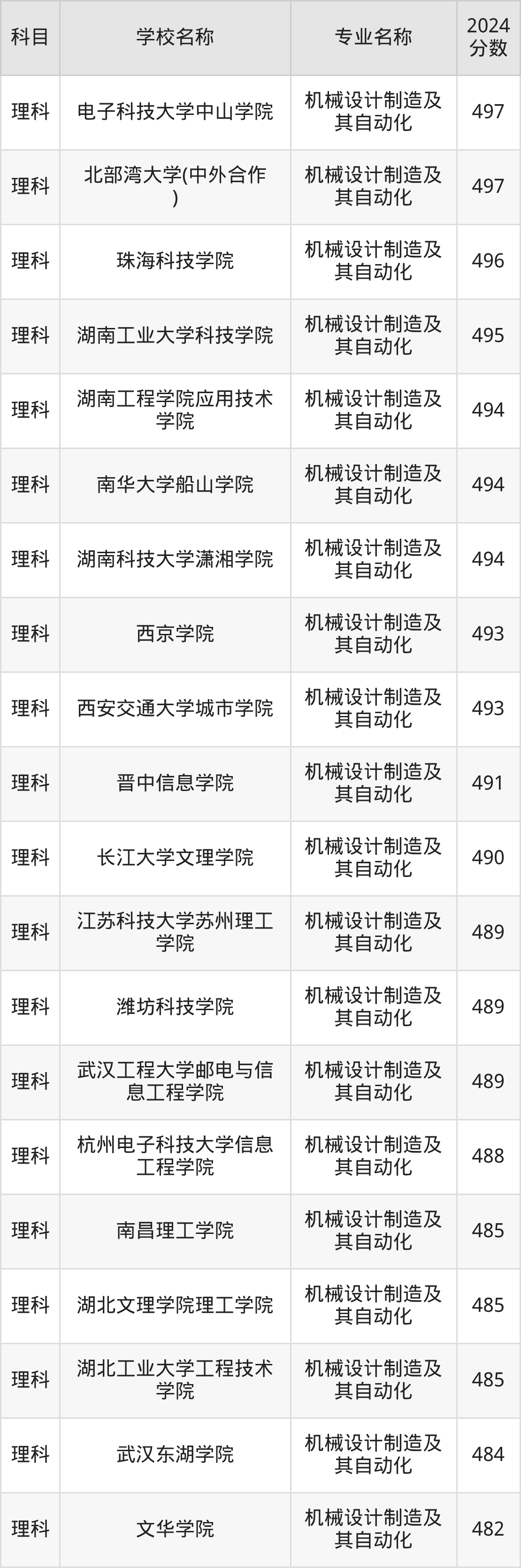 | 电子科技大学成都学院 | 机械设计制造及 其自动化 | 495 |