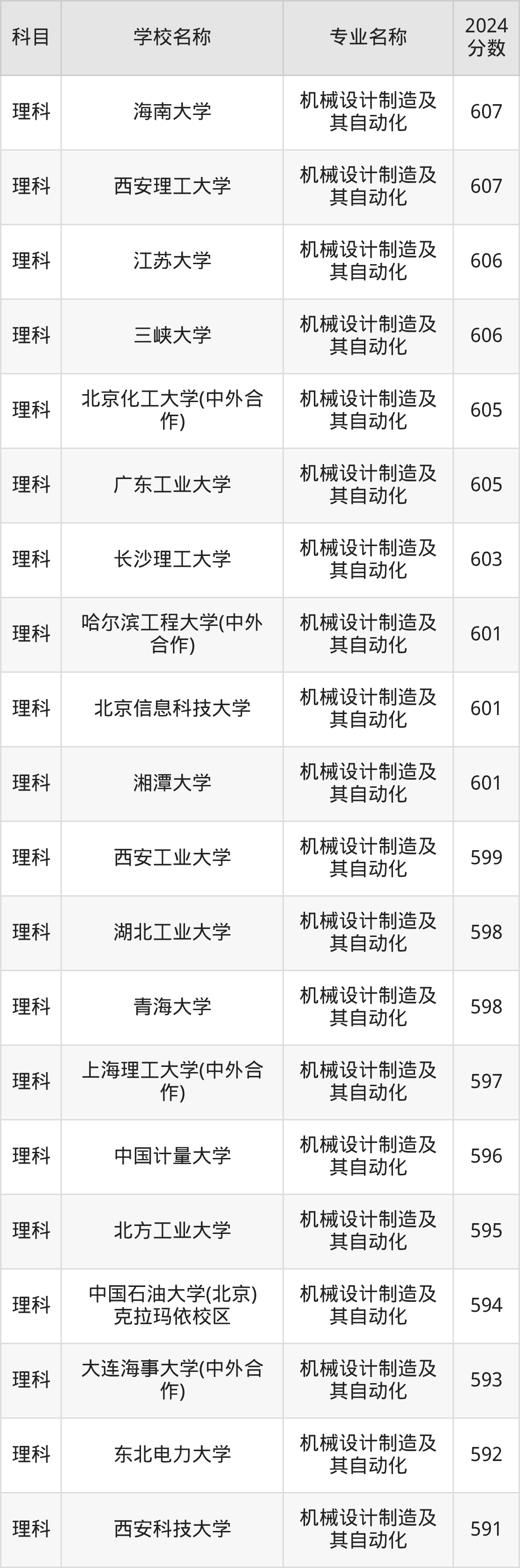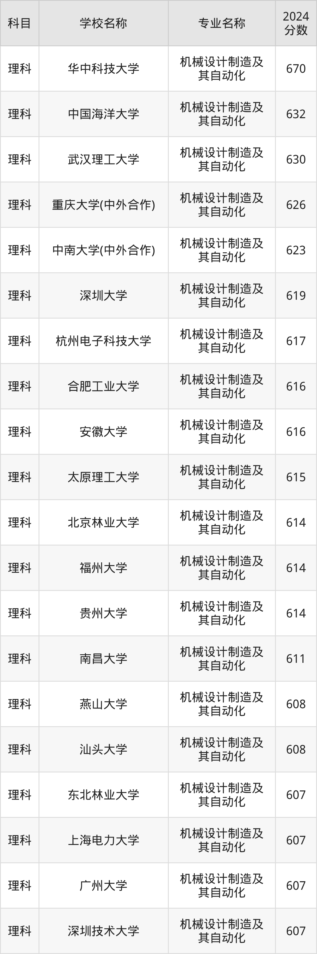 通过上文大家可以知晓,在四川省内招机械设计制造及其自动化专业的院校数量较少,所以下文将为2026届高考生继续展示:省外大学的机械设计制造及其自动化专业2024年在四川高考的录取情况,包含华中科技大学、中国海洋大学、武汉理工大学、重庆大学(中外合作)、中南大学(中外合作)。
