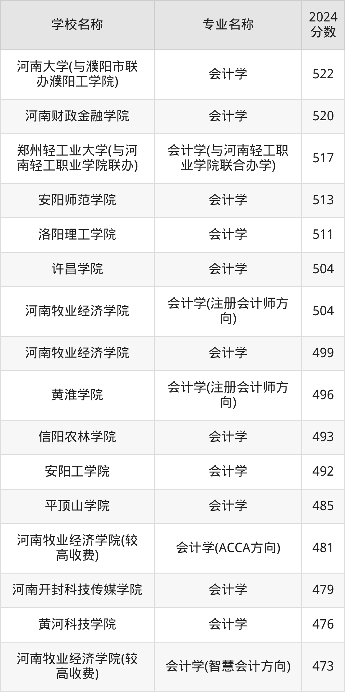 | 河南工程学院 | 会计学(注册会 计师方向) | 520 |