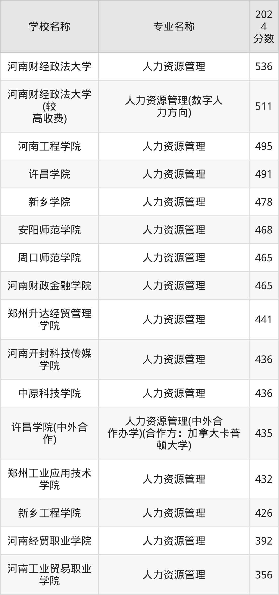 | 河南开封科技传媒学院 | 人力资源管理 | 474 |