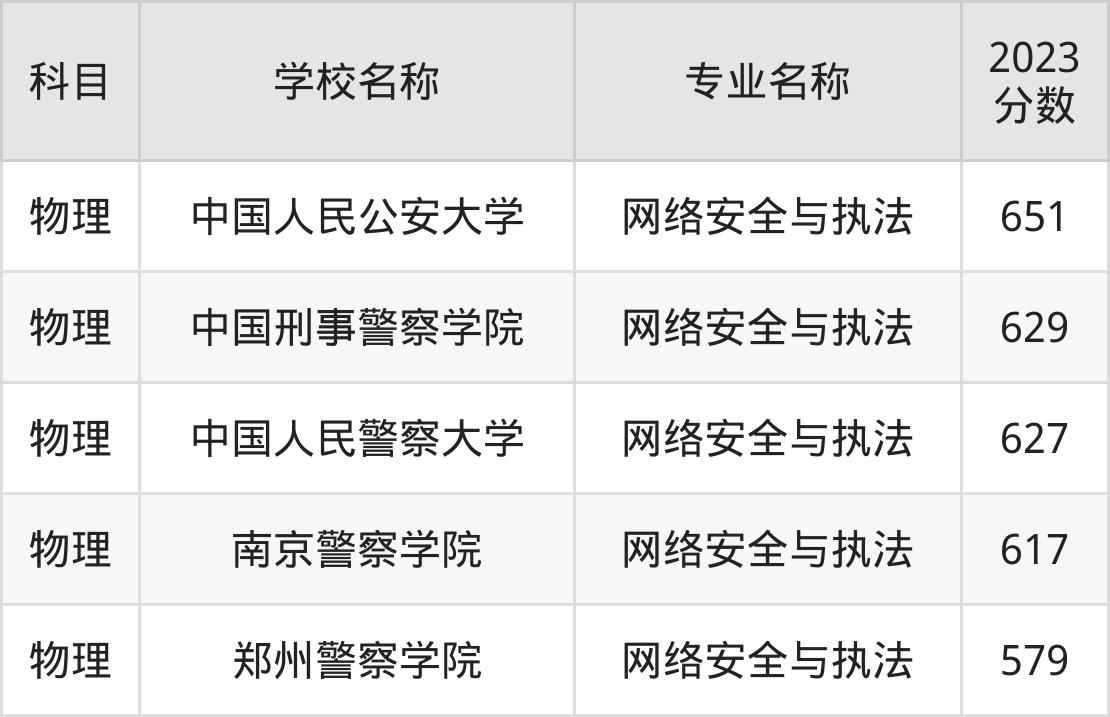 通过上文大家可以知晓,在福建省内招网络安全与执法专业的院校数量较少,所以下文将为2025届高考生继续展示:省外大学的网络安全与执法专业2023年在福建高考的录取情况,包含中国人民公安大学、中国刑事警察学院、中国人民警察大学、南京警察学院、郑州警察学院。