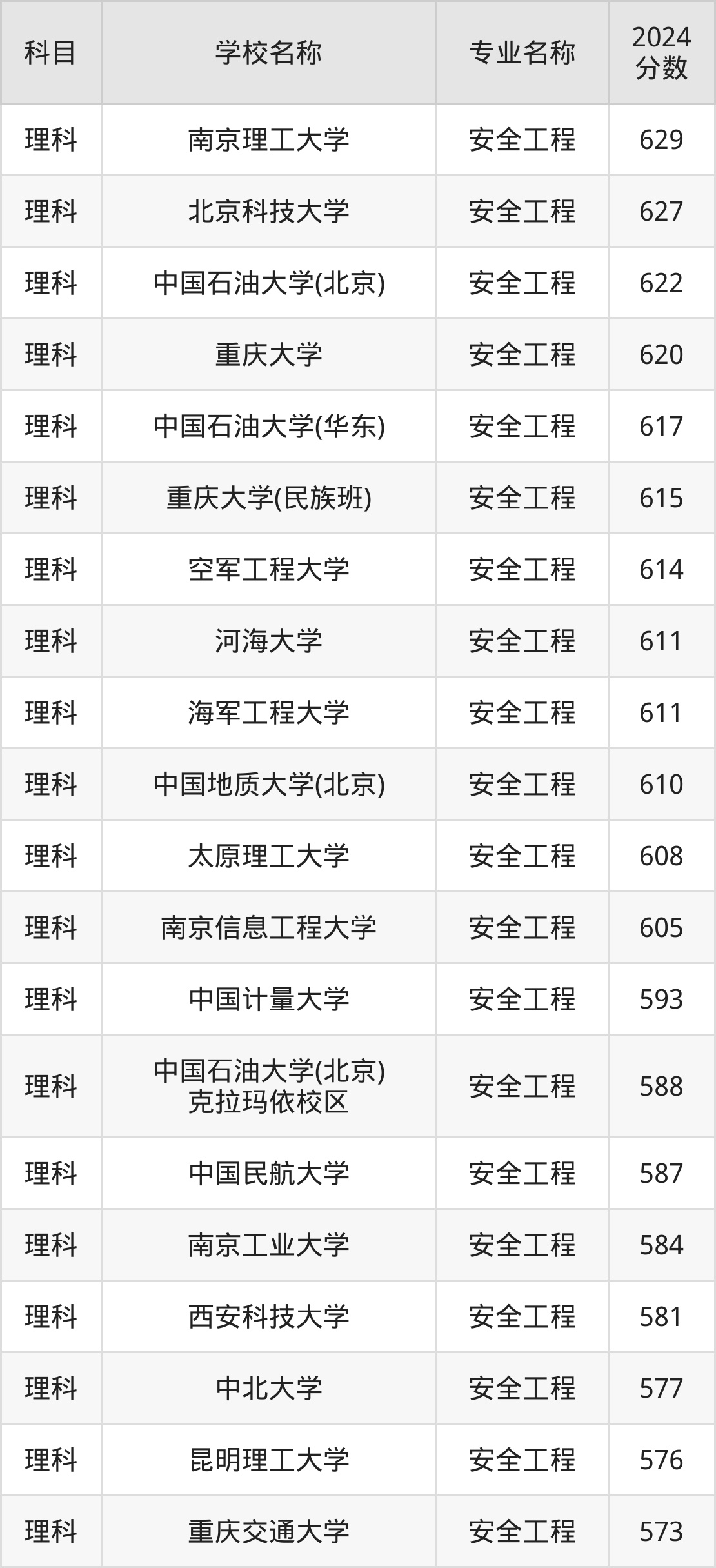 通过上文大家可以知晓,在四川省内招安全工程专业的院校数量较少,所以下文将为2025届高考生继续展示:省外大学的安全工程专业2024年在四川高考的录取情况,包含南京理工大学、北京科技大学、中国石油大学(北京)、重庆大学、中国石油大学(华东)。